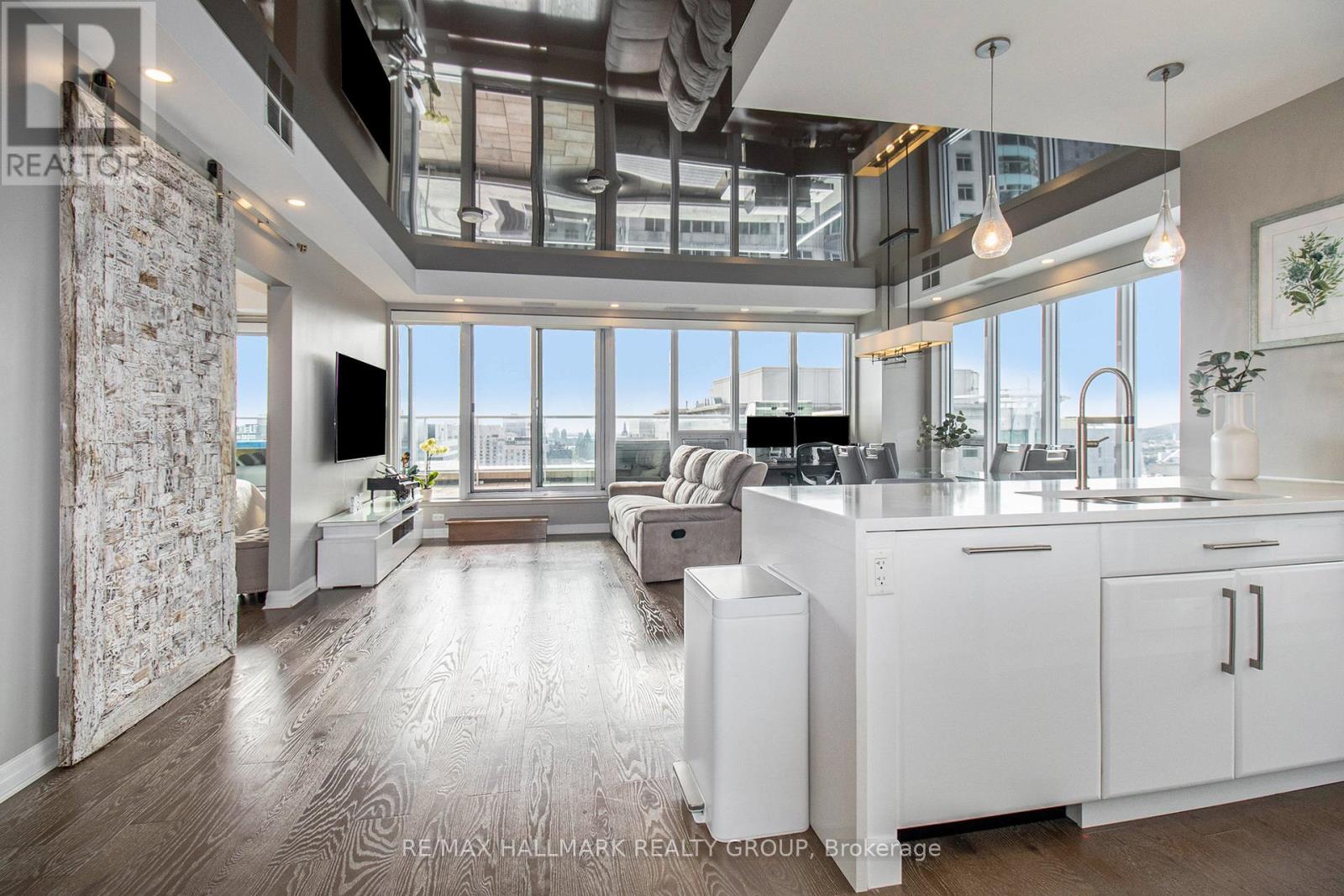 Experience the pinnacle of urban living in this stunning 2-bedroom, 2-bathroom penthouse, perfectly located in the heart of the nation's capital. The thoughtfully designed layout is ideal for entertaining, seamlessly blending open-concept living, dining, and kitchen areas. Expansive windows throughout the unit, fitted with controlled blinds, flood the space with natural light, creating a warm and inviting atmosphere. The chefs kitchen is a true showpiece, featuring high-end custom finishes, quartz waterfall countertops, and ample cabinetry. Step outside onto the expansive 316 sq ft terrace, where panoramic views provide a spectacular backdrop for gatherings with family and friends. Enjoy front-row seats to the Canada Day fireworks, making every celebration extraordinary! Building amenities include a gym, sauna, indoor pool, lounges, and 24-hour concierge service. The unit also offers two premium parking spaces and a spacious storage locker for added convenience. (id:58075)