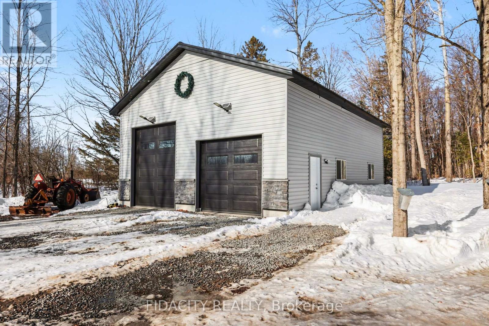 Located just outside Carleton Place, this spacious high-ranch sits on an oversized lot just shy of 2.5 acres, offering space, privacy, and incredible versatility. A major highlight of the property is the detached 1,200 sq ft garage built in 2023, featuring 15-foot ceilings and oversized doors (10' x 12' and 10' x 9'), making it ideal for hobbyists, contractors, vehicle storage, or workshop space.Inside, the home offers a bright and functional layout. The kitchen and dining area are centred around a fireplace and overlook the expansive lower living room below, creating an open feel with extra tall ceilings and large windows that fill the space with natural light.The kitchen also provides access to the laundry and mudroom, along with a screened-in porch overlooking the backyard and surrounding forest, a great spot to enjoy quiet mornings or evenings outdoors.The main level features 3 generous bedrooms and a large main bathroom, offering plenty of space for family living.The walkout basement provides additional living space with large windows, separate entry to the outside, a second full bathroom, and a functional theatre room. With its layout and separate access, the lower level offers excellent potential for an in-law suite or extended family space. Outside, the backyard is surrounded by mature trees creating a private setting, complete with an above-ground pool and deck that makes the space feel like your own backyard oasis.Conveniently located just minutes from the shops, restaurants, schools, and amenities of Carleton Place, this property offers the perfect balance of rural space and town convenience. septic field new as of 2023 (Ariel summer photo is an AI generated rendition simply to give me an idea of what summer looks like it) (id:58075)