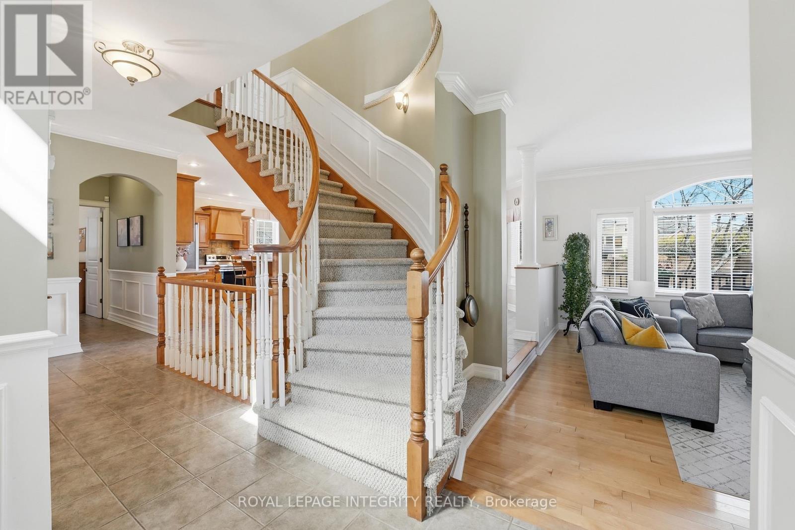 This incredible home is situated on a quiet street in one of Stittsville's most sought-after neighbourhoods, Granite Ridge. The curb appeal is undeniable, highlighted by a charming front veranda that sets the tone for the warm and inviting interior. The main floor offers a thoughtful and functional layout, featuring an oversized home office with a two-sided gas fireplace that connects to the great room- It creates a natural gathering space for family and friends. The kitchen is well-designed with an abundance of quartz countertop space, a walk-in pantry, a well-positioned window, and plenty of room for entertaining. A separate formal dining room adds flexibility and can easily serve as an additional living space or playroom. Practicality meets style with a main floor mudroom and quality wood finishes that continue throughout. Upstairs, you'll find four generously sized bedrooms, including a spacious primary retreat complete with a walk-in closet and a large ensuite featuring a Roman tub, separate shower, and double sinks. The secondary bedrooms are all well-proportioned, making this an ideal family home. The fully finished basement offers a versatile rec room, perfect for additional living space, a home gym, or media area. The backyard has a large deck surrounded by mature trees that provide great privacy. Key updates include the hot water tank, furnace, and roof. Located just steps to parks, recreation trails, and highly ranked schools, this home offers an exceptional lifestyle in a prime Stittsville location. (id:58075)