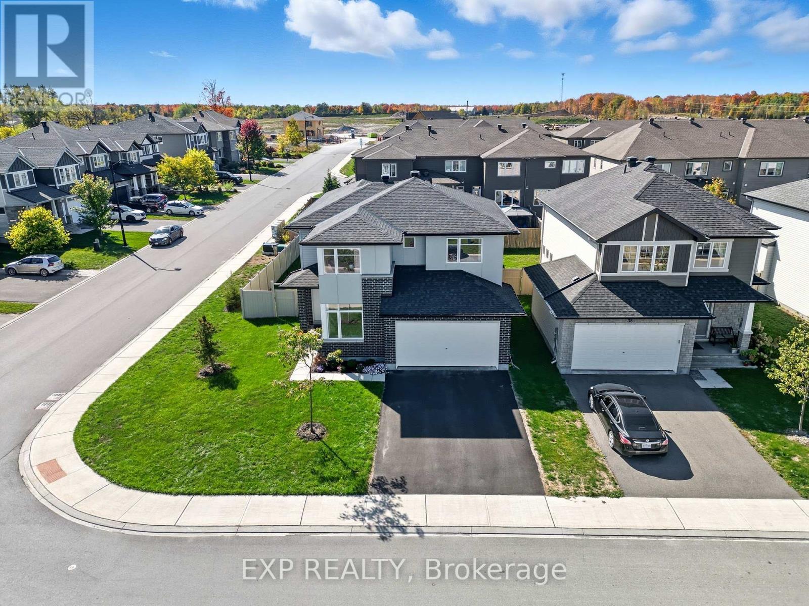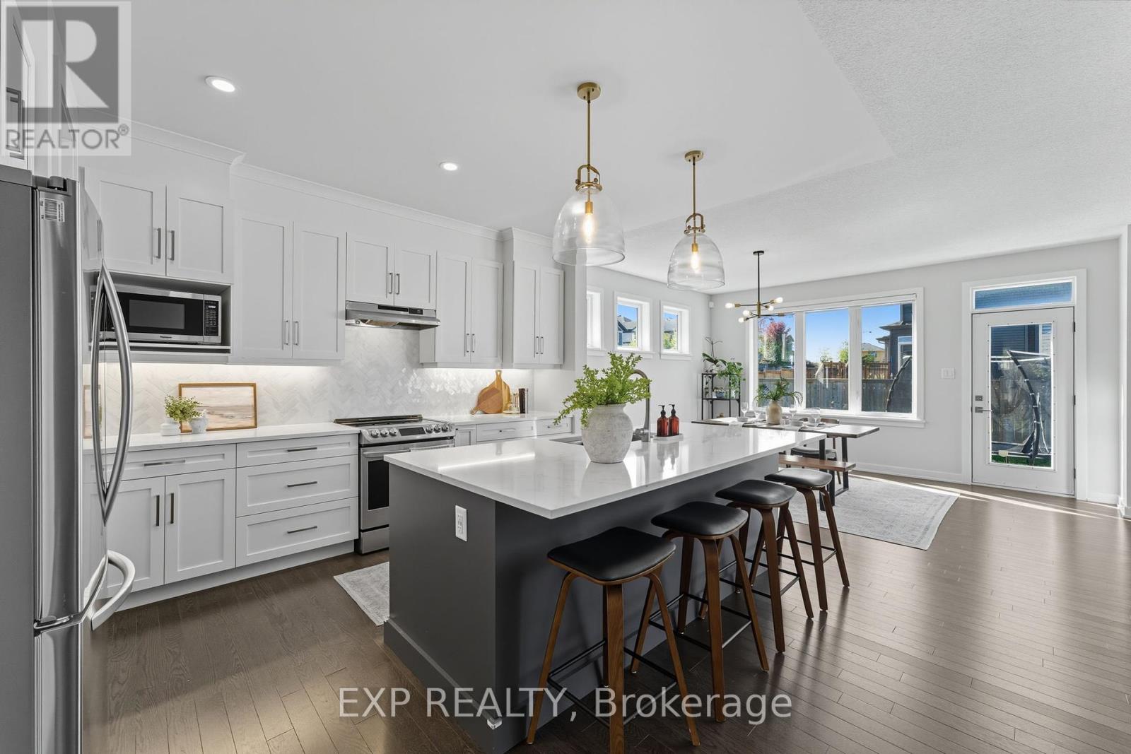 Welcome to this 2021 built Cardel Nichols Elevation A3, located in the sought-after Millers Crossing community of Carleton Place. Offering over 2,800 sqft of above-ground living space, this corner-lot property combines thoughtful design, extensive upgrades, and a prime location close to everyday amenities. The open-concept main floor features a chefs kitchen with stainless steel appliances, upgraded cabinetry, quartz countertops, undermount LED lighting, a walk-in pantry, and an oversized island with adjoining dining area. The kitchen flows seamlessly into the great room, highlighted by soaring 11 ceilings, sunlit floor-to-ceiling windows, and a sleek tiled gas fireplace with a modern mantel. Two large flex rooms, a mudroom, and a powder room add versatility and convenience on this level. Upstairs, the extended primary bedroom includes a walk-in closet and a luxurious 5-piece ensuite with private toilet enclosure. Three additional well-sized bedrooms, laundry room with custom cabinetry, and a full bathroom complete the second floor. This home showcases over $64,000 (before tax) in builder upgrades, including $32,000 in design enhancements such as upgraded hardwood flooring, premium carpeting, kitchen cabinetry, 8 interior doors, and quartz countertops throughout, along with $32,000 in structural upgrades including the premium corner lot, extended primary bedroom, and second flex room. The exterior offers a double-car garage with driveway space for 4 additional vehicles, a spacious fenced backyard (2023 @ ~$11,000), and close proximity to Millers Crossing Park just a 1-minute walk away. Everyday shopping is less than 5 minutes by car at Walmart Supercentre, Loblaws, and Home Depot, with quick access to Highway 7 and only 21 minutes to Kanata. (id:58075)