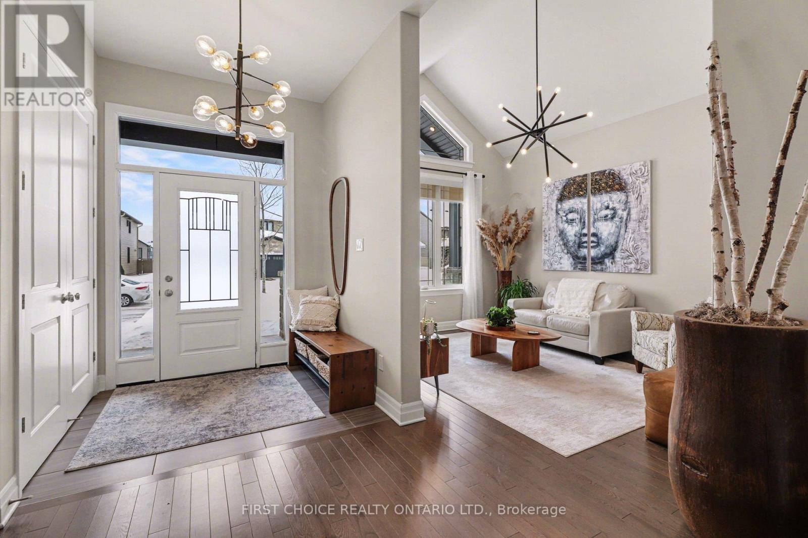 Gorgeous 3+1 bedroom bungalow by Woodfield Homes, located in a quiet, newer pocket of Morris Village in Rockland. Designed for both comfort and style, the main level features rich hardwood and ceramic flooring, cathedral ceilings, and an elegant double-sided gas fireplace that beautifully connects the living and dining areas. The sun-filled kitchen is the heart of the home, offering quartz countertops, a large island perfect for gathering, and an open flow into the inviting family room, where a second gas fireplace creates a warm, welcoming atmosphere. The spacious primary suite provides a private retreat with a luxurious 5-piece ensuite and walk-in closet.The fully finished lower level expands your living space with a fourth bedroom, generous recreation area, home gym, kitchenette/wet bar, full bathroom, utility room, and still plenty of storage space. Step outside to a fully fenced backyard designed for easy enjoyment, featuring tiered composite decking, landscaped gardens, and irrigation rough-in. The insulated double garage ensures year-round convenience. Ideally situated within walking distance to parks, outdoor skating rink, just minutes from the golf course, shopping, dining, and everyday amenities, this bright and beautifully maintained home delivers the perfect blend of space, comfort, and lifestyle. Pride of ownership, flex closing, come for a visit and stay a lifetime! (id:58075)