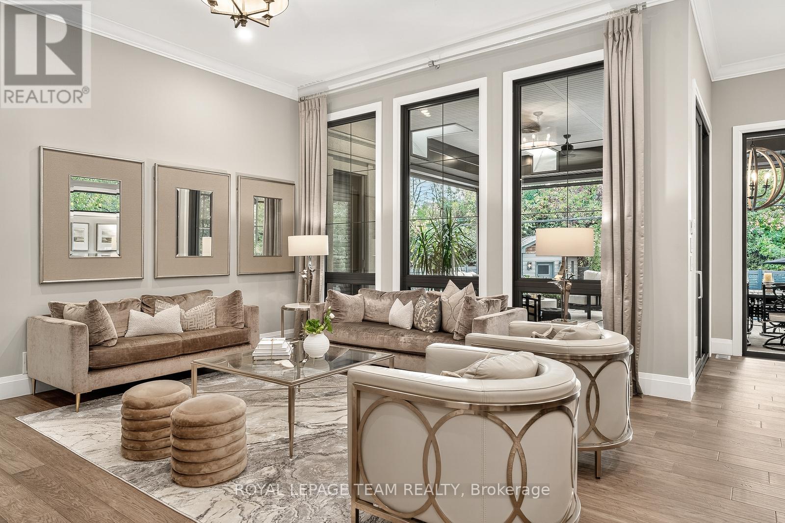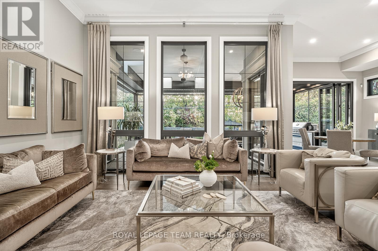 Nestled on a mature, tree-lined street, this residence is a true masterpiece that redefines luxury living in central Ottawa. This custom four-bed, five-bath architectural bungalow blends California cool with Provençal charm, offering rare serenity just minutes from The Glebe, Westboro, and Little Italy. Inside you will find soaring ceilings, floor-to-ceiling windows, distinguished craftsmanship and curated finishes to set a tone of effortless sophistication. The chefs kitchen flows seamlessly into a stylish open-concept living space and covered outdoor lounge, complete with built-in BBQ, motorized screens and fibreglass dipping pool. The primary suite is pure indulgence, with spa-style ensuite and oversized walk-in closet. A glass staircase leads to a lower level with a sleek rec room, wine cellar, gym, and two ensuite bedrooms with private access. No detail was overlooked in the design and build of this exquisite custom home - elevated, timeless, and functional. A rare opportunity to own a one-of-a-kind luxury home where design and lifestyle meet in perfect harmony. Urban living, reimagined. (id:58075)