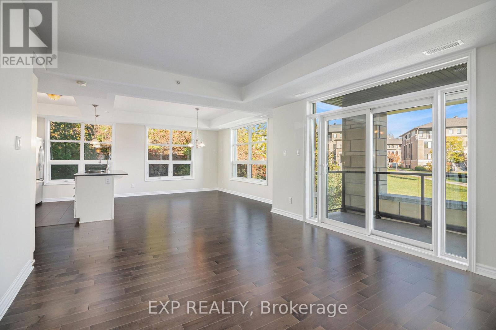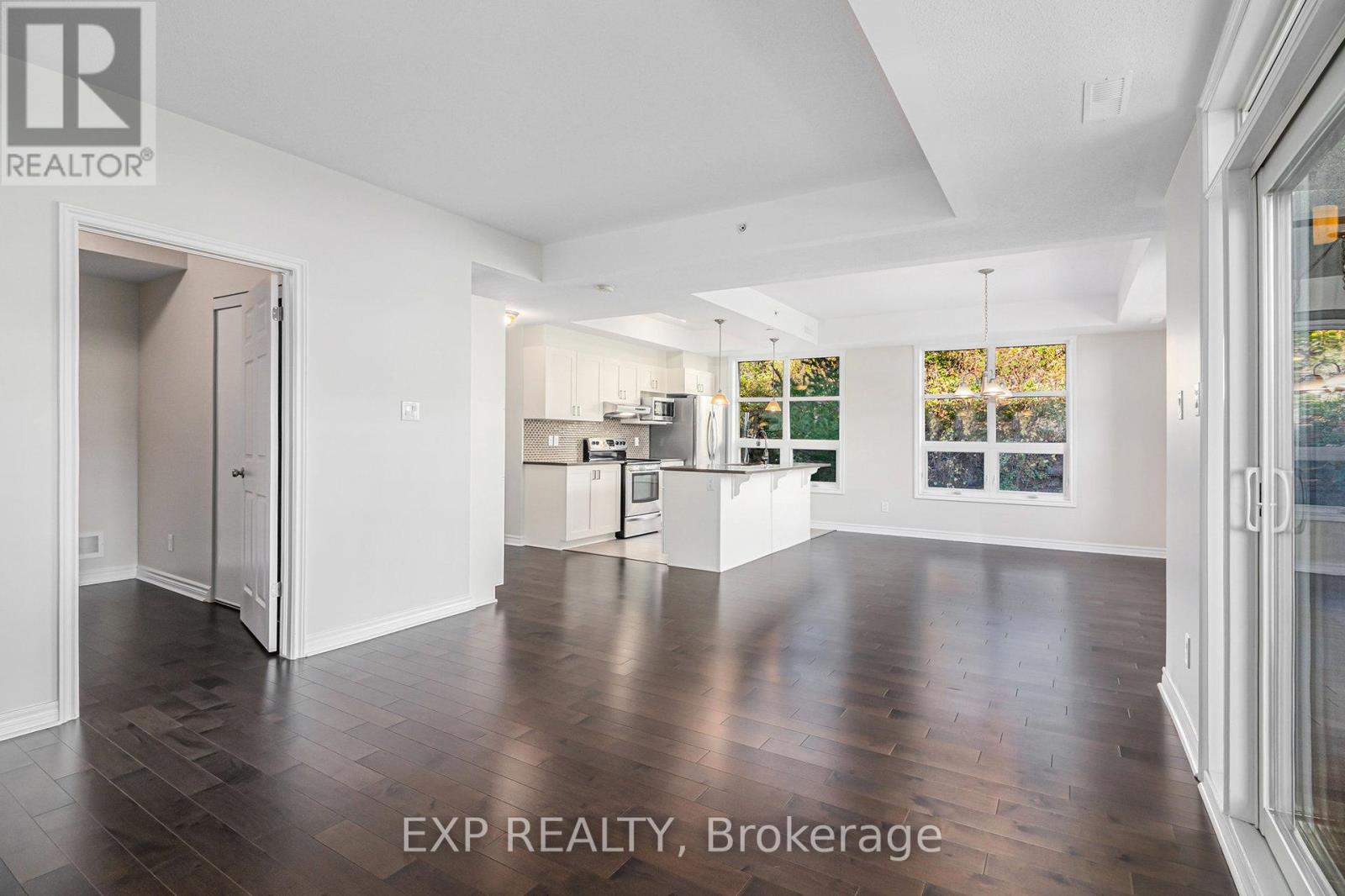 Experience premium single-level living in sought-after Quarry Glen! This turnkey 2 bedroom + den, 2 bath condo (with 2 parking spots!) combines style, comfort, and convenience in an unbeatable location and view - just a 3-minute drive to the O-Train station and offering quick access to Highway 174. The open-concept layout features a bright, welcoming living area that extends to a covered private balcony, perfect for relaxing outdoors. The kitchen boasts quartz countertops, backsplash, ample cabinetry, stainless steel appliances and an island with breakfast bar - ideal for both everyday living and entertaining. The spacious primary bedroom includes a walk-in closet and a 3 pc ensuite. A second bedroom and a versatile den provide flexible space for guests or a home office, complemented by a 4pc bathroom. Additional highlights include in-suite laundry, two parking spaces (1 in shared garage and 1 surfaced) and hardwood and ceramic flooring throughout - no carpet! Added bonus of an exclusive storage space in shared garage. Located in a building with elevator access, this condo offers easy maintenance free living. Enjoy nearby walking and cycling trails, parks, and all major amenities - Place d'Orléans Mall, Shenkman Arts Centre, restaurants, transit and more. Immediate occupancy available - move in and enjoy urban convenience! (id:58075)