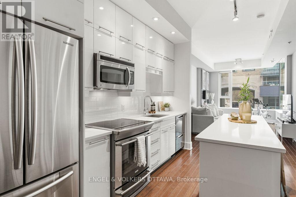 Rarely offered 1 bedroom + Study located just steps to Westboro and Wellington Village! This condo offers many coveted upgrades from soaring 9'8" ceilings, custom floor-to-ceiling built-in cabinets that span from the foyer to the kitchen, Hunter Douglas Blinds, and an oversized covered south-facing balcony. This 709sqft condo is perfect for those who work from home, but also love entertaining. With a dedicated workspace surrounded by ample storage that leads to an open concept layout. The gourmet kitchen impresses with all-white cabinetry, white quartz countertops, high end appliances including a Samsung Fridge, Fisher & Paykel Dishwasher, and Electrolux Stove. The 7'6" island offers seating for 4 - ideal for entertaining or casual meals. The living/dining is spacious with proper space for a couch and T.V, along with room for a 4-6 person dining table. Step outside onto the oversized, south-facing covered balcony (76sqft) to enjoy sunlight, fresh air, or 3-season entertaining. The primary bedroom has blackout Hunter Douglas blinds and custom built-in storage in the closet. The bathroom has an upgraded glass shower and a built-in cabinet. Amazing location - live just a 10 min walk to Lululemon, Equator Coffee, and top rated restaurants. Or, a 10 min stroll to the amenities along Wellington St. 1 underground parking (P3-114), 1 Storage Locker (P2-39) and 1 Bike Rack Included! Amenities include: Gym, Theatre Room, Party Room, Car Wash Bay, Pet Wash, and Rooftop Terrace with BBQs! Minutes from Bicycle Trails, Parks & Ottawa River Parkway. (id:58075)