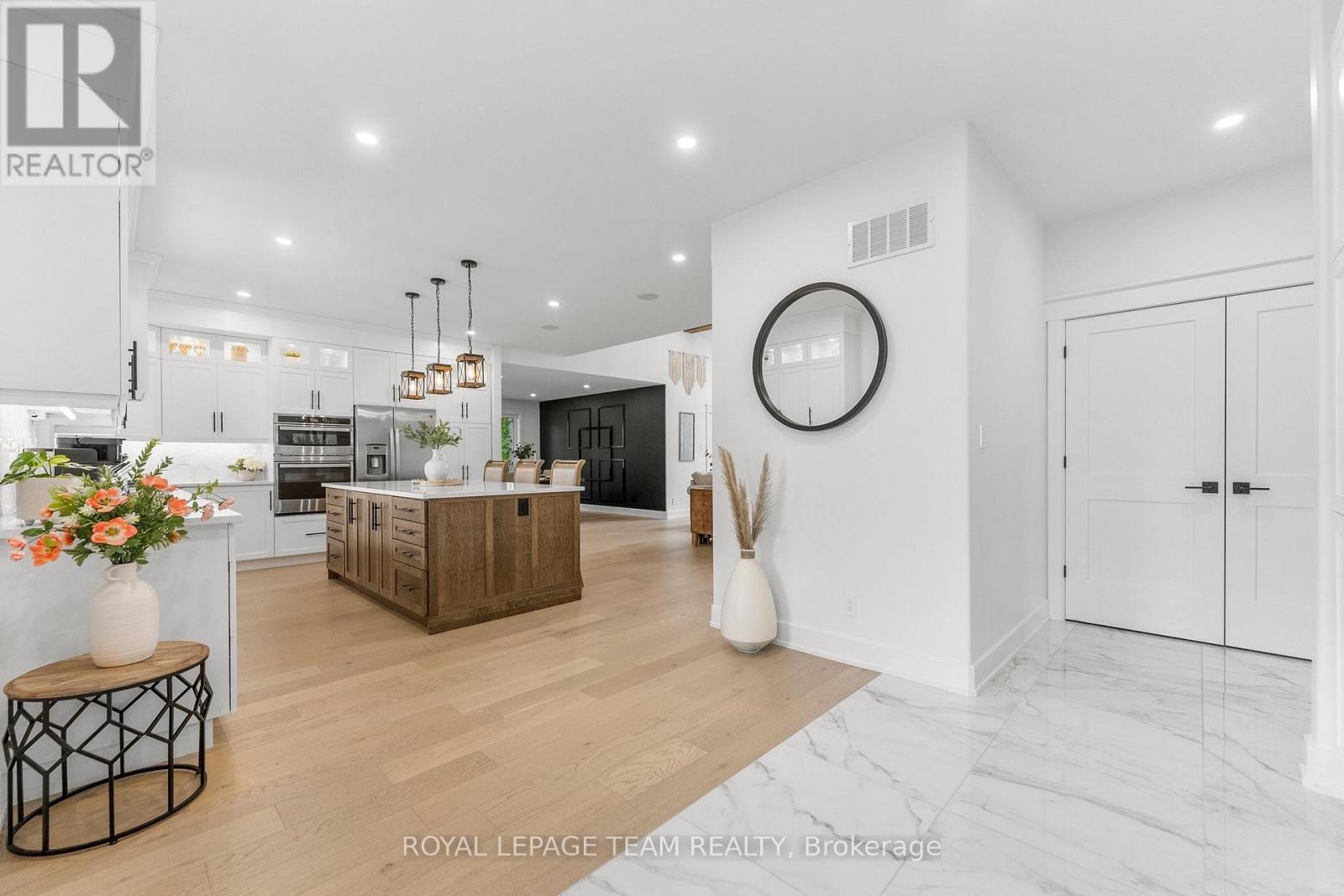 Welcome to this CUSTOM-finished, show-stopping BUNGALOW where luxury and lifestyle collide on a pristine 1-ACRE lot, just steps from the prestigious Eagle Creek Golf Club in beautiful Dunrobin - just 35 minutes from downtown Ottawa and 20 from Kanata. From the moment you arrive, you are greeted by the OVERSIZED DRIVEWAY and detached 2-car garage with a heated workshop. Inside the home, premium oak engineered hardwood and sleek marble-gloss tiles guide you through an OPEN-CONCEPT masterpiece. The kitchen is a chefs dream, featuring custom cabinetry with built-in lighting, a MASSIVE island perfect for gathering, a pot filler faucet for added convenience, and high-end stainless steel appliances. The dining area shines with a built-in hutch & bold ACCENT wall, while the living room stuns with CATHEDRAL ceilings, seamlessly flowing to a screened-in porch, ideal for entertaining or watching the game. Step onto the oversized COMPOSITE DECK, soak in the HOT TUB, and embrace outdoor living like never before. The main-level primary suite is a retreat of its own, boasting a SPA-INSPIRED 5-piece ensuite with heated marble flooring, a glass stand-up shower, a luxurious soaker tub, DUAL SINKS, and a walk-in closet. Another spacious bedroom and full bath complete this level. And yes, there is even your very own indoor GOLF SIMULATOR room. Practice year-round, rain or shine on this state of the art system. Downstairs, luxurious comfort continues - enjoy a FULLY FINISHED rec room with two distinct living areas, a dedicated exercise room, a third bedroom, and a full bath. This isn't just a home, it's a lifestyle - and it's waiting for you. Every detail found at this property has been meticulously designed and thoughtfully crafted from doors & hardware to lighting, flooring, paint and cabinetry. 12 hour irrevocable on all offers. (id:58075)