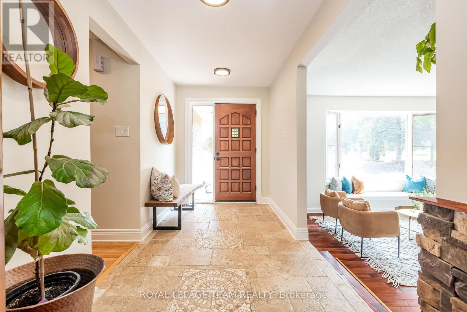A rare offering along a serene stretch of the Rideau River just moments from the heart of Manotick, this exceptional 3-bedroom, 2.5-bathroom estate bungalow is set on a beautifully landscaped 2.25-acre lot with 60 feet of pristine waterfront. A private paradise, the property features a resort-style backyard with a gorgeous salt water in-ground pool, mature trees, and sweeping views of the river. Step inside to discover a grand entry adorned with travertine marble flooring, leading to a spectacular library crowned by a vaulted cedar-plank ceiling. Floor-to-ceiling bookshelves, complete with a rolling ladder, create an atmosphere of refined charm, while a dramatic double-sided fireplace connects this space to the expansive sunken living room and rear deck beyond. The chef's kitchen is a showpiece, seamlessly open to the main living areas; designed for both entertaining and daily luxury. Rich granite countertops, an abundance of custom cabinetry, and a high-end gas range are paired with a unique breakfast nook offering warmth and style. Bathed in natural light, the four-season sunroom is a seamless extension of the living space, with multiple sliding glass doors opening to the tranquil grounds. The primary suite is a true retreat, with direct access to the deck, a cozy gas fireplace, custom walk-in closet, and an opulent 5-piece ensuite complete with double vanities, soaking tub, and glass-enclosed shower. The partially finished lower level with new flooring & 9ft ceilings offers flexibility for additional living or recreation space. Recently updated landscaping and a lush canopy of mature trees provide privacy and timeless beauty. Nestled in one of Ottawa's most coveted communities, this home is just minutes from boutique shops, fine dining, excellent schools, and the village charm that makes Manotick so desirable. (id:58075)
