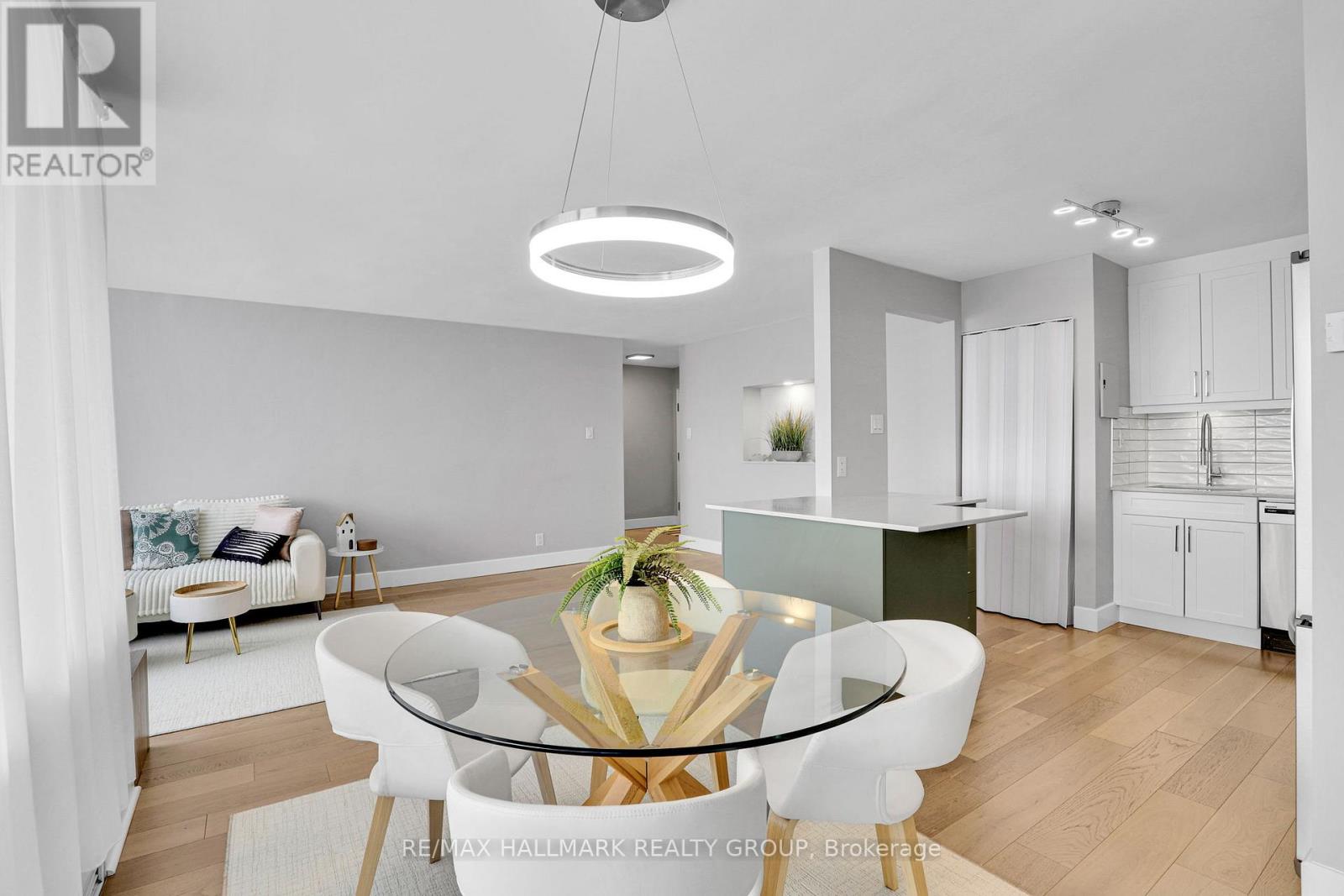 Welcome to Unit 1604 at Strathmore Towers, 1285 Cahill Drive, a stunning 2-bedroom, 1-bathroom condo sitting high on the 16th floor with breathtaking panoramic views of the Ottawa skyline. This bright and spacious approximately 945 sq ft open concept unit offers exceptional value and modern living in Ottawa's south end, featuring engineered hardwood floors, freshly painted walls, and updated lighting throughout. The showstopper kitchen boasts white shaker cabinets, quartz countertops, a subway tile backsplash, a sage green island with built-in storage, and a full suite of stainless steel Whirlpool appliances. The full bathroom features a sage green vanity with quartz countertop and a fully tiled tub and shower with rain shower head. Large windows flood the space with natural light and showcase those incredible elevated city views from every room. Rare in-suite stacked washer and dryer and heat pump for year-round heating and cooling. One underground parking spot included. Residents also enjoy access to an outdoor pool, party room, and guest suites, with shopping, transit, and parks all close by. Updates include kitchen (2019), appliances (2020), bathroom (2010), engineered hardwood flooring (2010), heat pump (2008), fresh paint (2021), and lighting (2022). Condo fees of $976.88/month cover ALL utilities for completely worry-free living, making this the perfect opportunity for first-time buyers, downsizers, or investors. (id:58075)