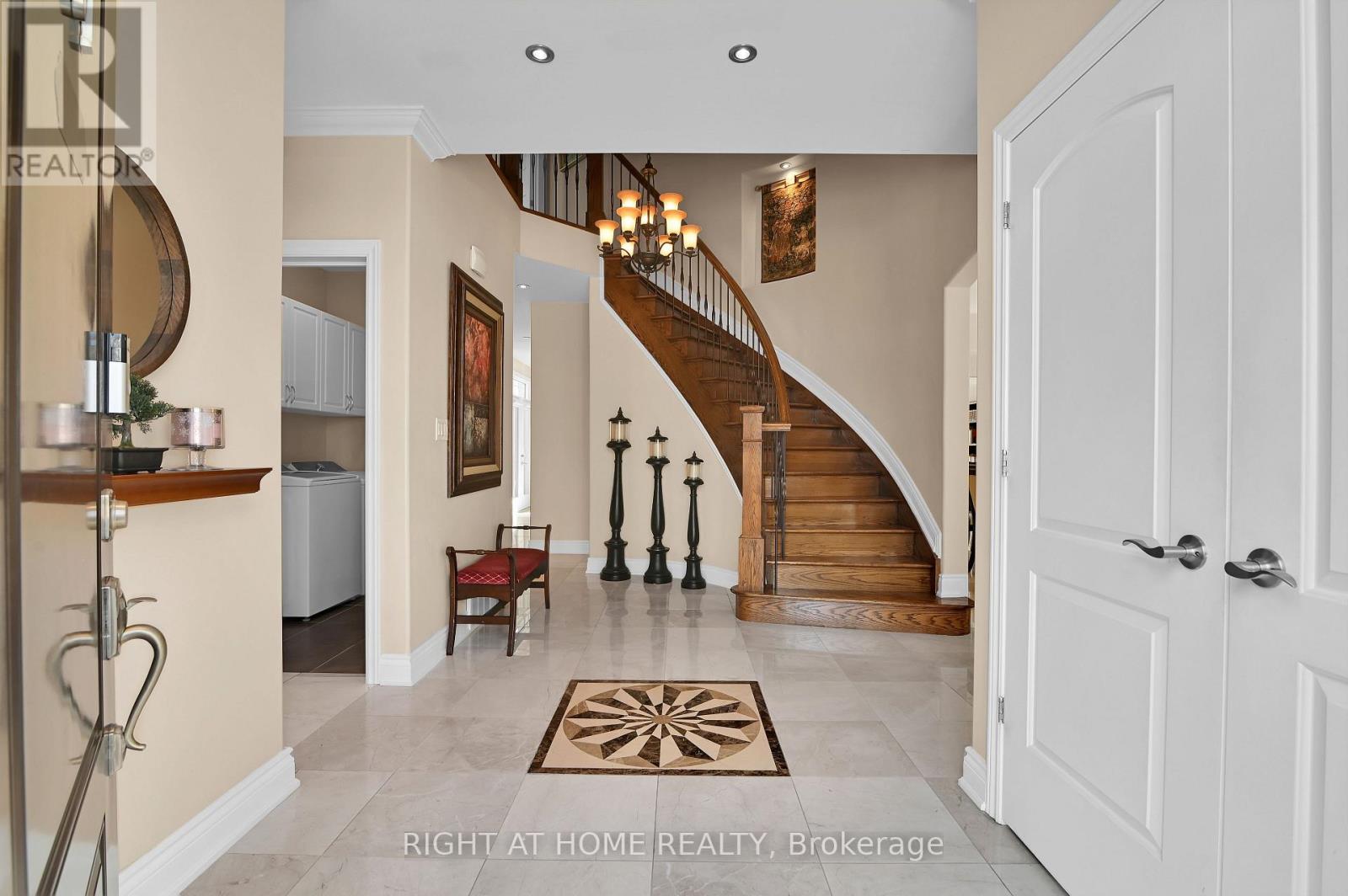 Tucked away in a peaceful enclave, this custom-built stone house delivers sophisticated design, premium finishes, and an enviable lifestyle. It sits on a beautifully landscaped corner lot surrounded by vibrant flower beds and is perfect for summer entertaining, morning coffee/evening relaxation under the stars. Step into the grand foyer featuring custom inlaid marble medallion floor in a dramatic compass design, a curved oak staircase with hardwood stairs and ornate wrought-iron railings, and soaring ceilings bathed in natural light. The main level flows effortlessly into generously proportioned principal rooms. The gourmet kitchen is a chef's dream with rich dark cherry wood cabinetry, sleek black granite countertops, a large central island with breakfast bar and top-tiered stainless steel appliances. It opens seamlessly to the family room anchored by a striking stone fireplace and warm hardwood floors. Adjacent, the formal living and dining areas impress with arched windows dressed in custom blinds, multiple chandeliers, crown moulding, and neutral designer tones that create an inviting yet refined atmosphere. You will love the 11 feet super high ceiling through out and an additional office/bedroom in the corner to meet your various needs. Upstairs are three spacious bedrooms offer oversized windows flooding with light and a serene palette. The master bedroom ensuite features his and her sink, dark wood vanity and a separate toilet with a close door and.Downstairs, the fully finished recreation room is an entertainer's delight-complete with a full-size ping-pong table, comfortable lounge seating, and can be converted to an in-law suite by adding a small kitchenette. This house was designed by the current owner and was built with love and passion: 9-inch poured concrete foundation, solid wood, reinforced roof support just to mention a few. 750$ per year association fee to cover the snow plowing for the private rd. Hot-water tank is rental at 50$ including hst. (id:58075)
