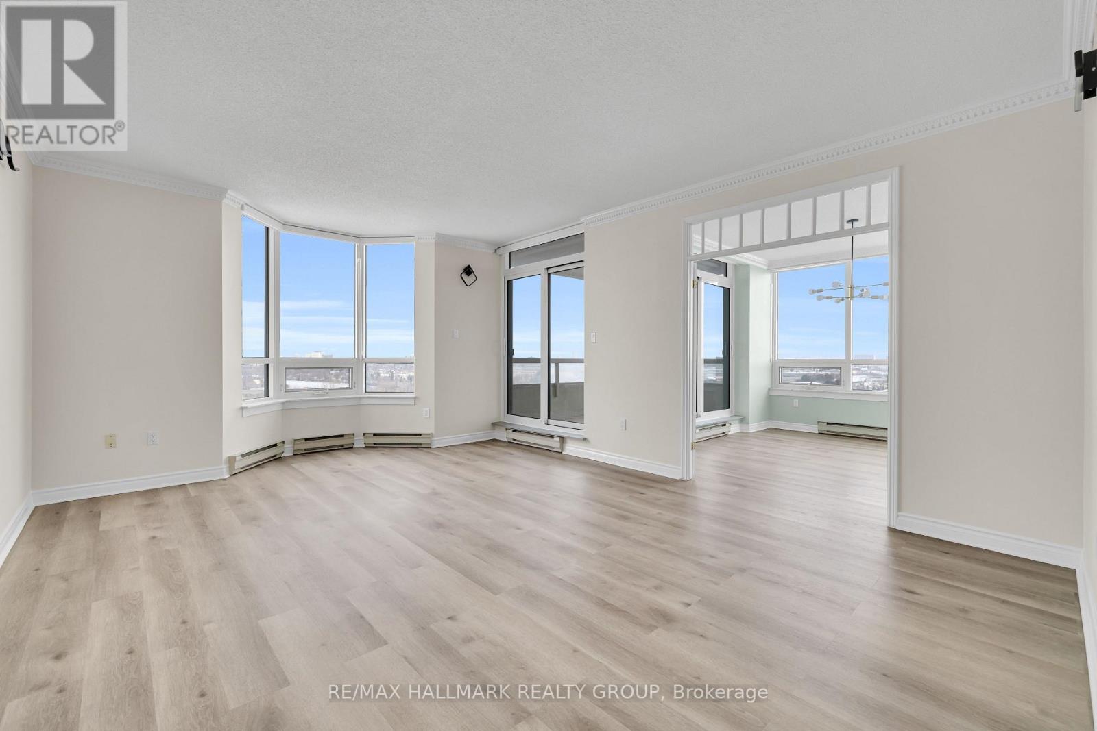 Welcome to "The Classics at Riviera" - this elegant 1990 sq ft condominium offers 2 bedrooms plus a den, 3 bathrooms and an unparalleled lifestyle with an array of top-tier amenities. Boasting a bright and spacious floor plan with marble foyer, high ceilings, new gleaming hardwood floors and an abundance of windows. The generous living room, den, and formal dining room provide ideal spaces for both everyday comfort and entertaining. The well-appointed kitchen features granite countertops and opens to an inviting eating area. Impressive primary suite, complete with two walk-in closets and a luxurious 6-piece ensuite with Roman tub and separate shower. The unit also features a spacious secondary bedroom, additional full bathroom, and convenient powder room. Additional highlights include a balcony, in-suite laundry, underground parking, and a storage locker. Residents enjoy an abundance of exceptional amenities, including a fully equipped fitness centre, weight room, indoor pickleball court, indoor pool, sauna, and steam room. Entertain in the elegant party room with piano and dining area, relax in the library, or enjoy the games room with pool table and a separate ping pong room. Outdoors, beautifully landscaped grounds feature walking paths, fountains, BBQ areas, an outdoor pool, and tennis courts. Added conveniences include a hair salon, meeting room, concierge services, and 24/7 gated security. Ideally located minutes to the 417, Trainyards shopping, and a short walk to Hurdman LRT station, this exceptional condominium offers the perfect blend of luxury &convenience! Tenant pays heat, hydro and tenant insurance. (id:58075)