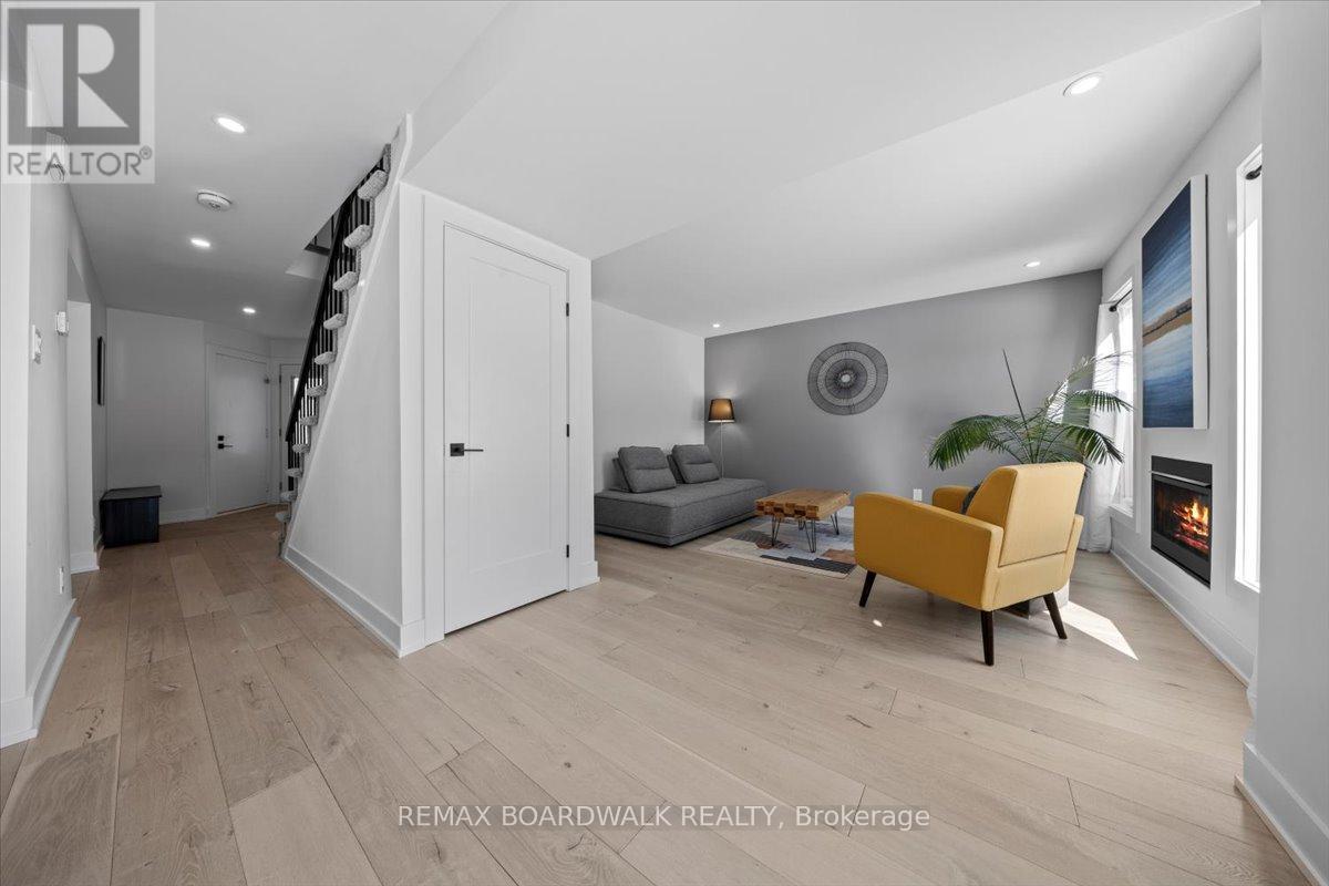 Welcome to a thoughtfully updated home blending classic architecture with refined modern interiors. The brick facade is complemented by black trimmed windows and an upgraded front entry, creating a strong exterior presence. An interlock walkway leads to a covered veranda, while the extended driveway accommodates parking in addition to the garage w EV charger. Inside, a bright foyer introduces wide plank 5" luxury flooring, flat ceilings, and clean baseboards throughout the main level. A staircase with wrought iron spindles creates a striking architectural feature. Main floor room offers flexibility as a home office or additional living space. The open concept layout connects the kitchen, dining, and living areas, designed for both everyday living and entertaining. Expansive windows and dual garden doors bring in natural light and lead to the backyard. The dining area is highlighted by statement lighting, while the living room offers space to unwind. The kitchen features quartz countertops, an extended island with seating for 4, SS appliances, fluted hood fan, wall pantry, and pendant lighting. White cabinetry with matte black hardware adds a clean contemporary contrast. The 2nd level offers 4 great sized bedrooms, updated bathrooms, and a dedicated laundry area. The primary suite features 5 windows, a walk in closet, and a 5 pce ensuite with oversized tile, double vanity w quartz counters, glass shower, and deep soaker tub under a window. A bay window enhances the largest secondary bedroom. The finished basement adds a spacious rec room with pot lights, flat ceilings, and a flex room for gym, office, or play space. The backyard is bordered by mature hedges for privacy and includes a patio stone area with open green space. Located in an established neighbourhood with quick access to HWY, transit, parks, FR + EN Schools, groceries, library, etc. 24 Hour Irrevocable on offers (id:58075)