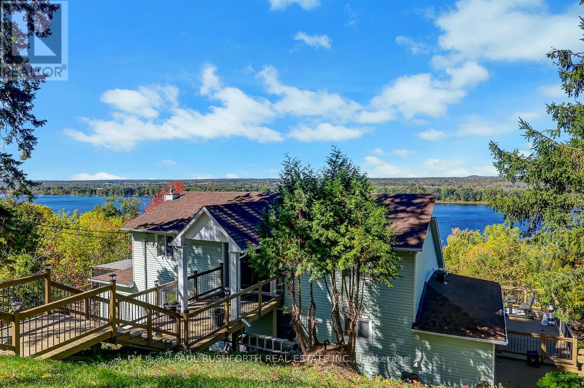 Absolutely one of a kind property on a 1.73 acre lot with unbelievable views of the Ottawa river and Gatineau hills. This unique home offers an open layout with a loads of function including a kitchen that offers lots of cabinet and counter space with a handy breakfast bar, quartz counters and stainless appliances overlooking the expansive living and dining room that can accommodate any sized table and features a gas fireplace, a sunroom with wood burning stove and incredible views, a family room, a den/library, a newly renovated full bath and laundry room. The upper level boasts three large bedrooms, a large foyer and a stunning brand new full bath with walk in glass shower, dual sinks with lighted/fog free mirrors and a giant soaker tub. With mostly hardwood throughout the house, brand new fridge, dishwasher and microwave, ultra quiet windows, fresh paint and new carpets and boasting a large deck on the east side and a deck with gazebo on the west side, two storage sheds, an oversized detached insulated and heated garage all on a huge private lot with a park nearby and just minutes to town this is one of those homes you just have to see to believe. Some photos have been virtually staged. (id:58075)