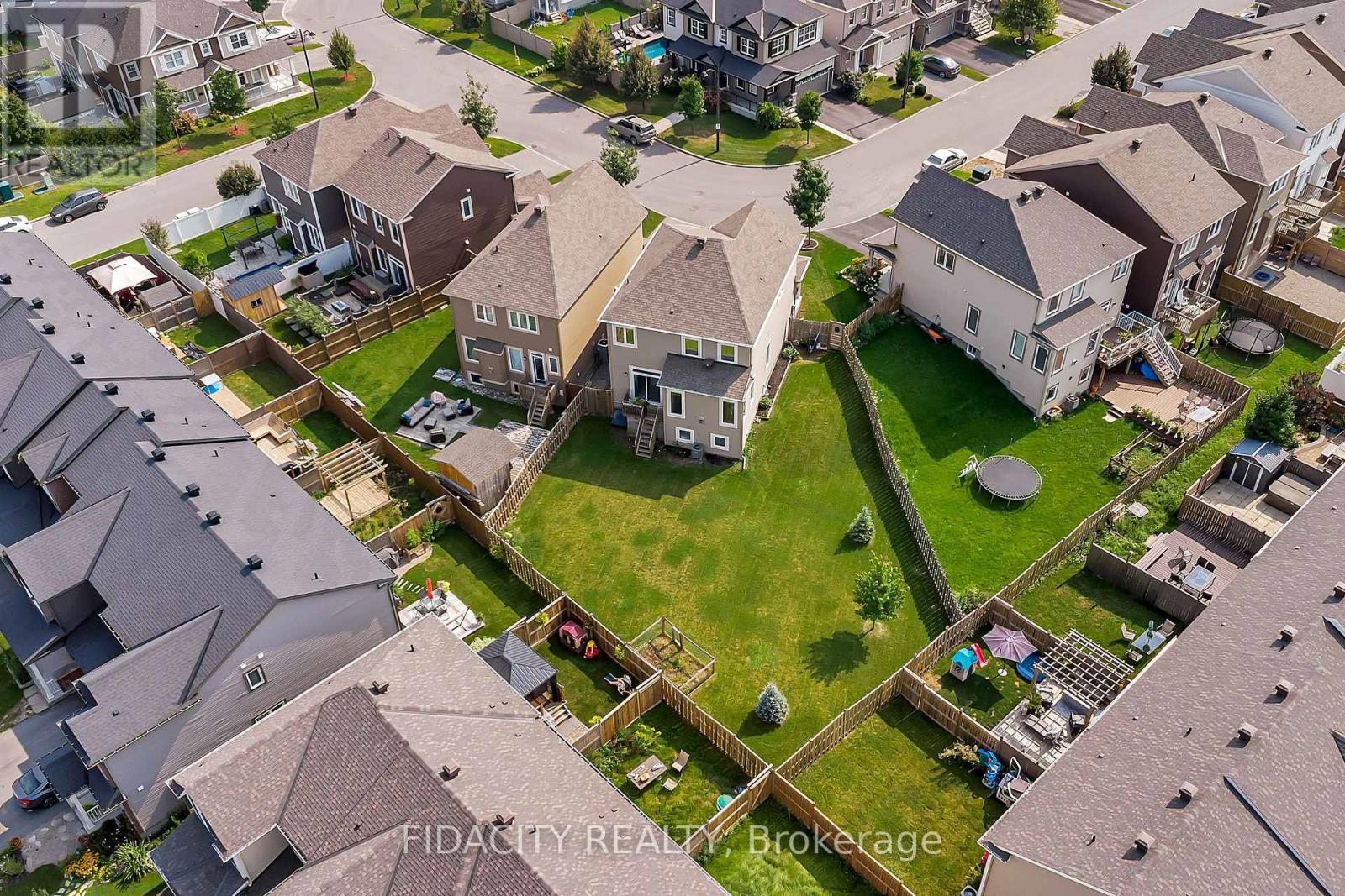 Welcome to a home that gives you space-inside and out. Set on an oversized lot in the sought-after Fairwinds community, with a double car garage, this 4-bedroom, 4-bathroom home offers a great balance of comfort, layout, and location. Located on a quiet circle, yet just minutes to the 417, Canadian Tire Centre, Tanger Outlets, schools, grocery stores, multiple parks, splash pads, outdoor rinks and much more!The main level is bright and open with 9-foot smooth ceilings, hardwood and ceramic flooring, and a layout that flows easily from room to room. Extra windows bring in tons of natural light and offer a beautiful view of the expansive backyard. The living room is anchored by a gas fireplace, adding warmth and a natural focal point. The chef's kitchen is the centre of it all, featuring quartz countertops, a large island with seating, a dedicated coffee bar, and plenty of storage, all open to the dining and living areas for easy entertaining. Upstairs offers three well-sized bedrooms, including a spacious primary suite at the back of the home with a walk-in closet and a full ensuite with double sinks, a deep soaker tub, and a separate walk-in shower. A full main bathroom and second-floor laundry complete this level.The finished basement adds valuable living space with a fourth bedroom with proper egress, a full bathroom, and a rec room-perfect for guests, teens, or a home office setup.Outside, the fully fenced oversized yard provides plenty of room to relax, entertain, or enjoy time outdoors, with mature trees (2 spruce, and one red maple) offering added privacy in the summer months. Move-in ready in a location that keeps everything close by. Completed in recent years: mature trees added, ceilings smoothed, second-floor carpet replaced with hardwood, basement finished with bedroom, a large bathroom with glass shower, and driveway resealed. (1907 sq ft above grade + finished basement) (id:58075)