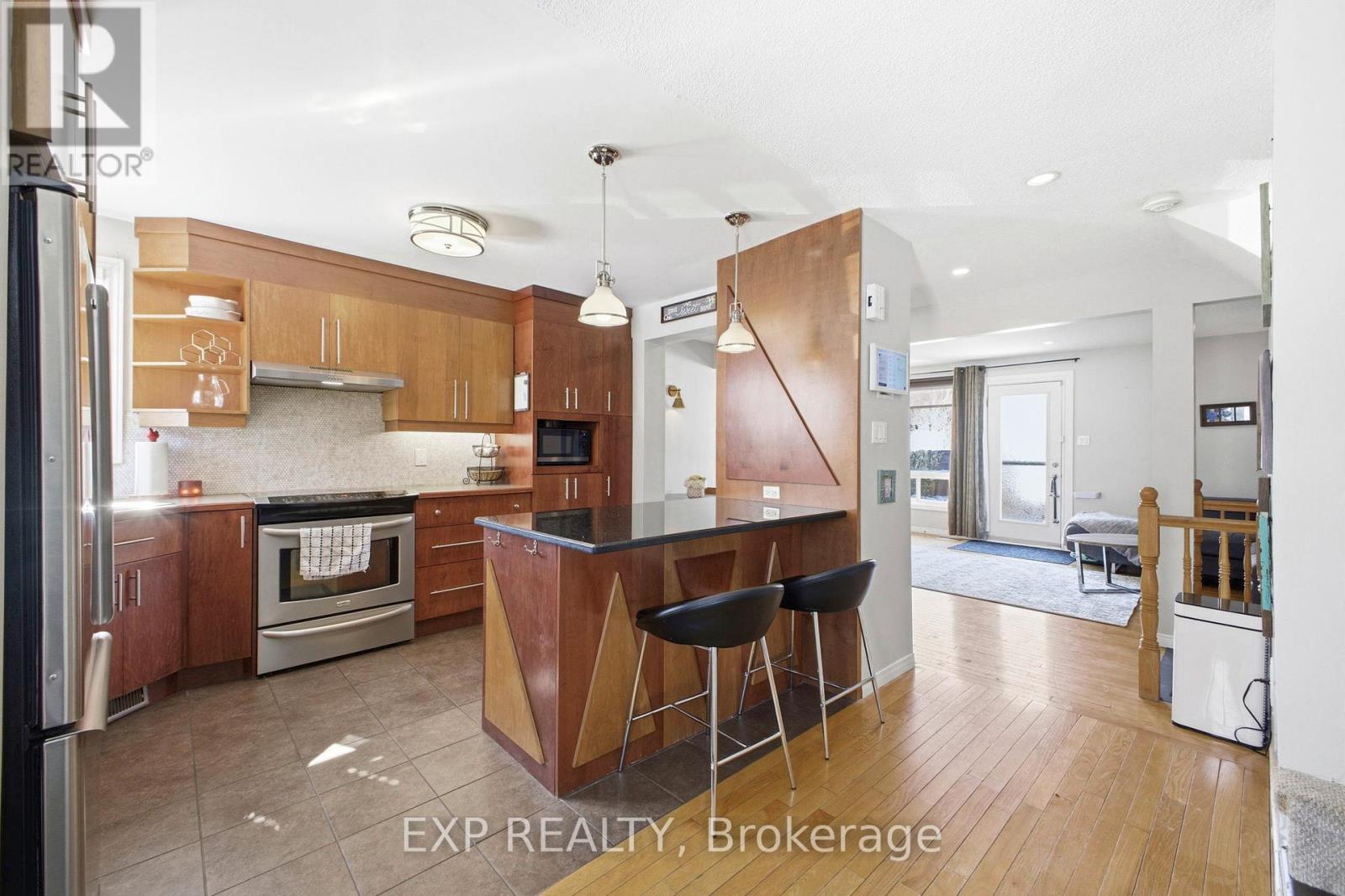 Wonderful updated End Unit Townhome, in a great location in Katimavik. Walking distance to schools, shopping, parks, amenities, and excellent transit service. This 3 bedroom home has an Open Concept Renovated Kitchen with loads of cabinet space, beautiful backsplash, and corner windows allowing for beautiful bright light. The Breakfast bar island has a Granite Countertop, and opens to the Dining area with overhead chandelier lighting. The bright and open Living Room has Patio door access to the fully fenced backyard. Great living space for entertaining, featuring hardwood flooring and pot lighting throughout. On the second level the Large Primary Bedroom has a wall of closets, and two bright new sliding windows and the Spacious 2nd and 3rd bedrooms are perfect for extra family members. Upstairs also includes the 4 piece main bath with updated vanity sink and new tub surround. The Fully Finished Basement is a great area for a bedroom, family room, home office or entertainment area, and also includes an updated 3 piece bathroom with shower. Private fenced backyard with patio and shed, backing onto green space. Over $30K in electrical upgrades, including New Panel, LED lighting, Commercial Wiring, and Generator Panel with Outdoor Inlet. With new backyard patio landscaping, updated bathrooms, New Interior Doors, New windows, Siding and all new insulation in attic, this on is sure to impress. This unit also boasts the only private driveway on the entire street, making it easy to park. Don't miss out! (id:58075)