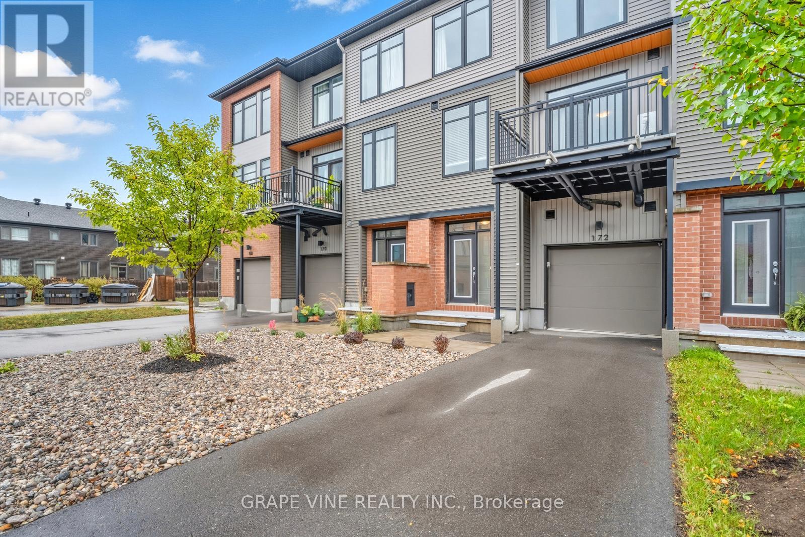 Available for immediate occupancy. Welcome to 172 Visor Private! Absolutely stunning, three story, EQ Luna Model City Townhome in sought after and popular Stittsville! Built in 2021, this 2 bedroom, 1.5 bath boasts a modern design and beautiful features, including an attached garage with garage door opener as well as a balcony of the living and dining area. The home is filled with natural light with north facing windows. The kitchen is tastefully designed with white cabinetry, white tile black splash, high-shine granite countertops, pot lights, and 9 foot ceilings. Large bedrooms with oversized windows, with the primary bedroom having a large walk-in closet. Washer and dryer are conveniently located on the third level off the bedrooms. Landscaping is maintenance free with river rock, perennial shrubs and ornamental grasses.Come live in this popular, family, friendly neighborhood, surrounded by nearby parks, schools, major shopping, Canadian Tire Centre, transit and much more! Freehold with association fee, which includes road maintenance.Flooring: Ceramic flooring on main level, hardwood on second level and carpeting on stairs and bedrooms.Including air conditioning, window blinds and eavestrough. Private road fee of $145.70/month for maintenance and garbage. (id:58075)