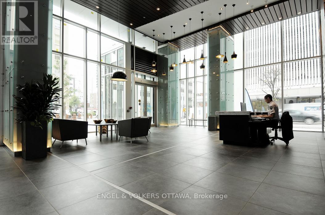 Luxurious 1-bedroom + den CORNER unit, spanning 805 sq. ft.-one of the largest 1 bed. floor plans in its collection. This sophisticated residenceoffers an open-concept layout with floor-to-ceiling windows that provide million-dollar, unobstructed downtown views from the 20th floor. Thecustom kitchen is equipped with granite countertops, a beautiful new backsplash, and elegant white cabinetry. Sliding doors open to a privatebalcony, perfect for enjoying the city scape. The versatile office/den area is conveniently located to the right of the kitchen. The large primarybedroom boasts a corner window and a dedicated study area. Additional features include in-suite laundry (2024), custom roller blinds (2025),hardwood floors, and updated light fixtures throughout the unit. A parking space and storage locker are also included. Residents will enjoy anarray of amenities, including a 24-hour concierge/security service, a guest suite, a terrace, an outdoor patio with BBQs, an indoor pool, a gym,and a conference room. For ultimate convenience, Farm Boy is located on the ground level, with amazing restaurants and an LCBO just stepsaway. The building offers quick access to Parliament Hill, Rideau Centre, the University of Ottawa, and the Financial District. (id:58075)