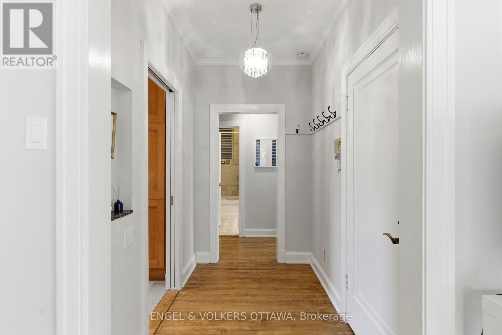 Step into timeless charm with this unique main-floor condo in the heart of Sandy Hill, just steps from the University of Ottawa and the Rideau Centre. Located in a quiet, self-managed building of only three units, this rare offering combines character, space, and an unbeatable central location. Built in 1937 with a classic full brick exterior, the building welcomes you through a formal foyer that sets the tone for the elegant interior. Offering over 1,100 square feet of living space, the unit features high ceilings, hardwood floors, and custom blinds throughout, highlighting the home's historic character while providing modern comfort. The living room features a beautiful bay window, filling the space with natural light. Beautiful glass bifold doors open to a peaceful and bright den with abundant south-facing windows overlooking the front garden, ideal as a home office, cozy reading room, or yoga space. The spacious dining room, complete with charming wainscotting, is perfect for hosting formal dinners and entertaining guests. The recently refreshed (2025) kitchen features solid-wood cabinetry, stainless steel appliances, and convenient access to the back entrance and basement, where you'll find two large private storage lockers.The primary bedroom includes another elegant bay window, a wall of custom built-in closets, and an additional original closet. The second bedroom offers in-unit laundry and flexible space for a guest room, home office, or both. This well-maintained building is home to long-standing, mature neighbours and has seen several important recent upgrades, including the roof, boiler system, heat pumps/AC, brickwork and masonry, and electrical. Condo fees include heat, water, and snow removal - just pay hydro. Unit freshly painted and new light fixtures installed (2025). Ideally located close to the Canal, ByWard Market, the uOttawa and Rideau LRT stations, NAC, the Rideau River, and Strathcona Park, with easy access to the 417 and King Edward Avenue. (id:58075)