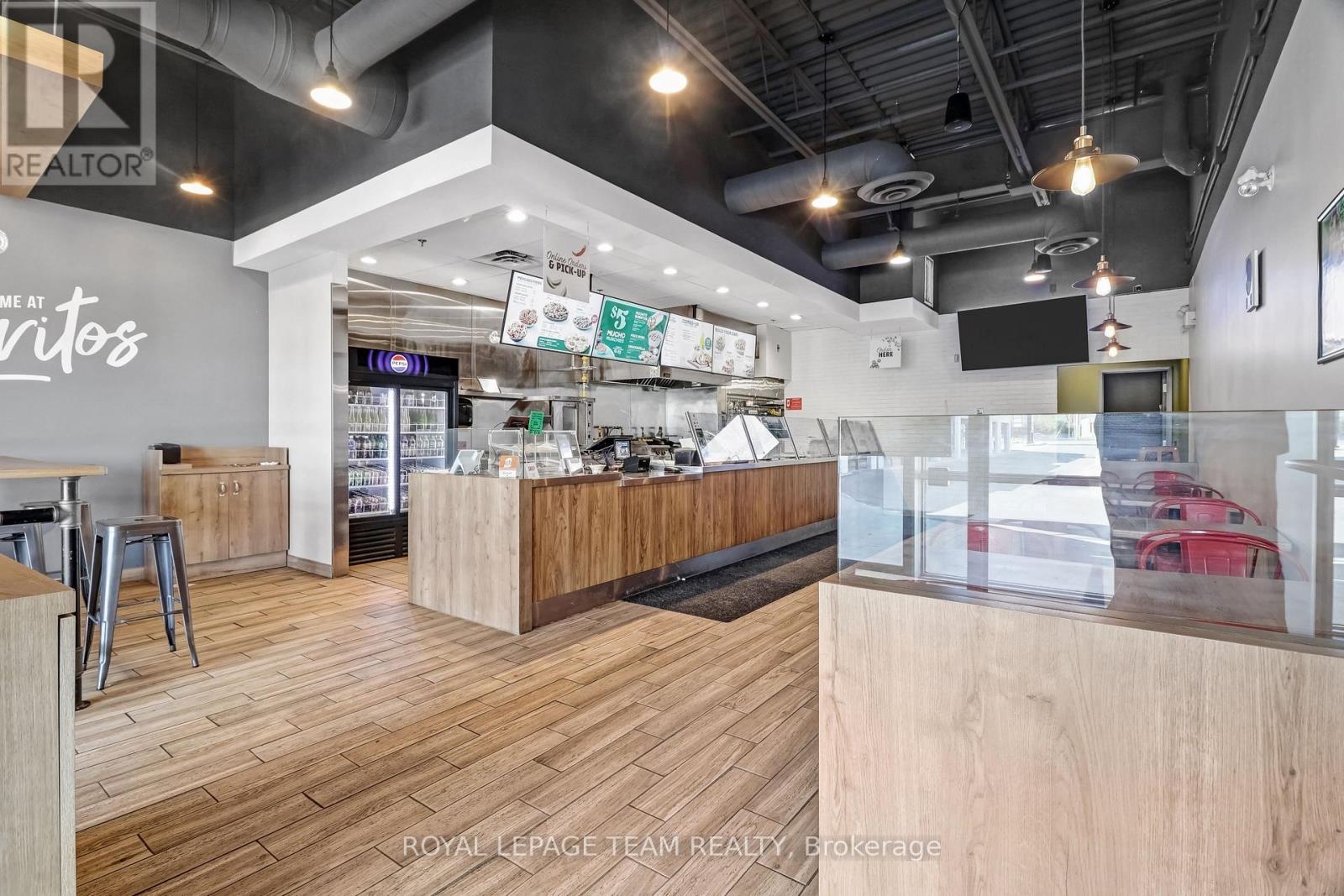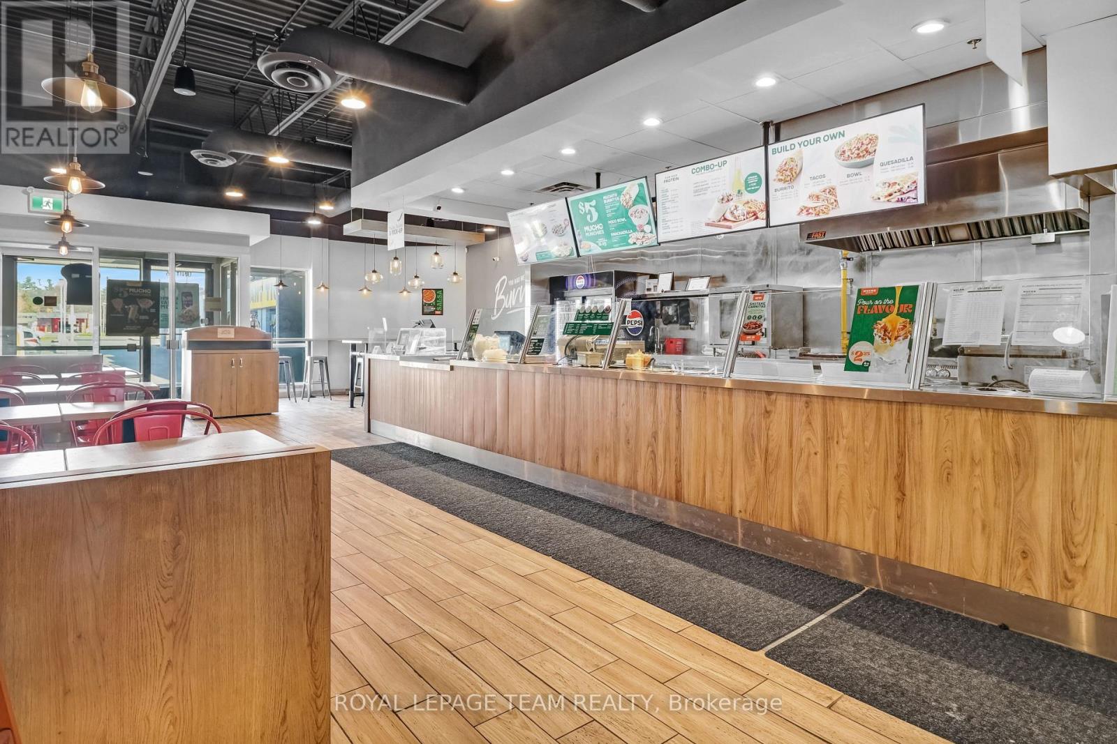A fantastic opportunity to own a well-established franchise location of Mucho Burrito situated in the high-traffic heart of Bells Corners. This is a beautifully maintained, modern fast-casual restaurant that stands out with its bright, clean, and contemporary design, offering a welcoming and highly appealing atmosphere for both dine-in and takeout customers. As you enter, you are greeted by a sleek and efficient front service areafeaturing the signature open-concept burrito build front counter, where guests can watch their meals being prepared fresh right in front of them, showcasing a wide and vibrant selection of fresh toppings and ingredients, all designed to deliver a fast, engaging, and customized dining experience. The layout is intuitive, fast-moving, and designed for strong operational flow even during peak hours. The kitchen is exceptionally well designed, offering an easy and efficient workflow that supports high-volume service. It includes ample storage, extensive refrigeration and freezer capacity, and a highly functional back-of-house setup. The wash-up and clean-up areas are spacious, well organized, and built for smooth day-to-day operations, helping maintain excellent hygiene and efficiency standards. Additional highlights include generous storage throughout the back-of-house and a private, comfortable office space-ideal for administrative work, scheduling, and day-to-day management tasks. This location combines strong brand recognition, a proven franchise system, and a modern, turnkey facility in a prime Ottawa-area location in Bells Corners, making it an excellent opportunity for an owner-operator or investor looking to step into a streamlined and successful restaurant model. (id:58075)