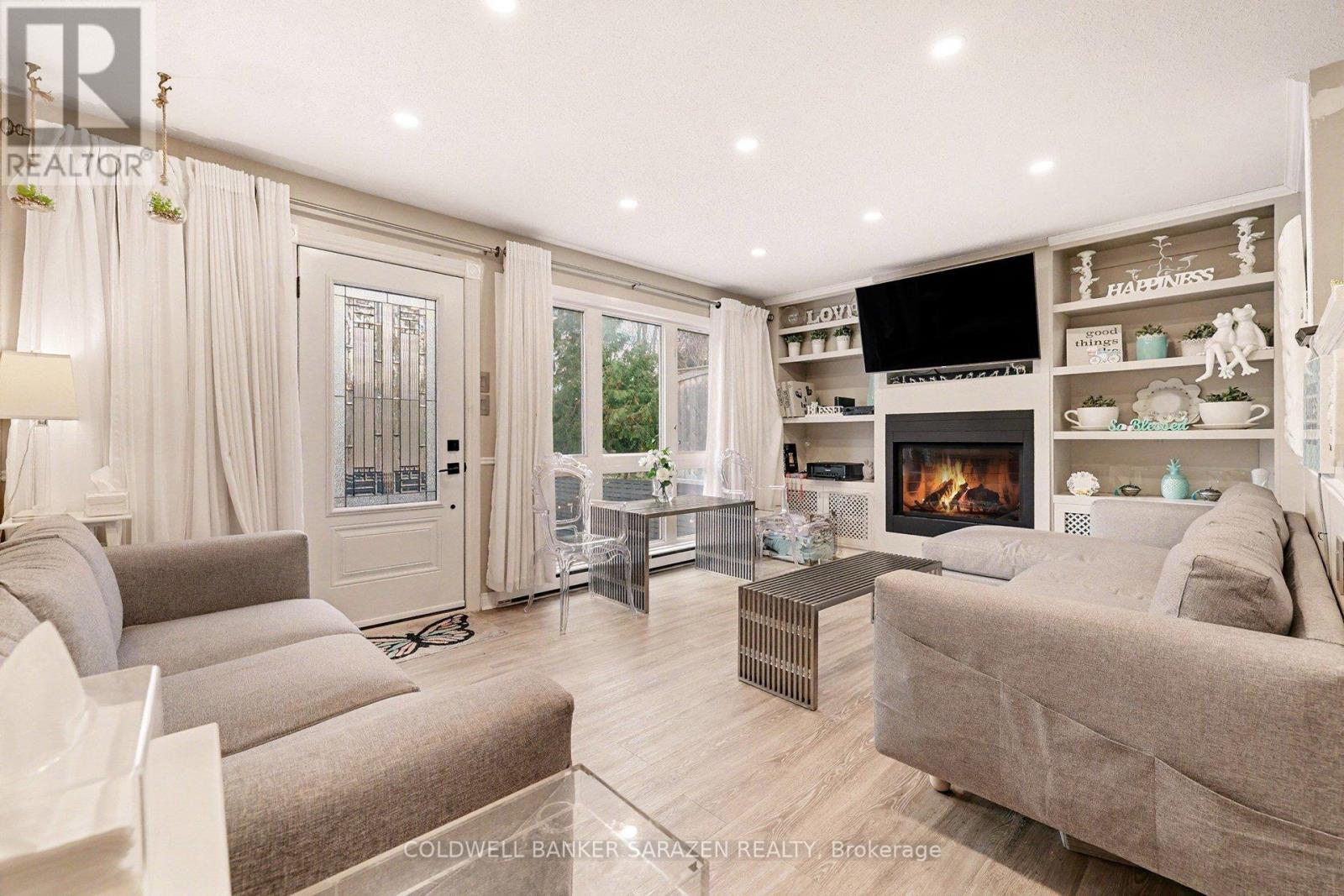 Beautifully maintained 3-bedroom condo townhouse in the sought-after Katimavik neighbourhood, offering an attached garage with inside entry and a bright, inviting layout. The cozy living room features a gas fireplace, built-in shelving, and patio doors that open to a private fenced backyard with a deck and serene wooded backdrop. The kitchen is equipped with stainless steel appliances and a convenient pantry. Upstairs, you'll find three spacious bedrooms and a full main bathroom. This move-in-ready home includes numerous updates such as an upgraded backyard (2024), backyard door (2025), new pot lights (2024), flooring (2020), baseboard heaters (2020), doors (2020), a finished basement (2023), new washer and dryer (2019), and an updated upstairs bathroom (2019). New outlets for the entire home(2023), Outdoor pool. Perfect for those seeking comfort, privacy, and a great location. (id:58075)