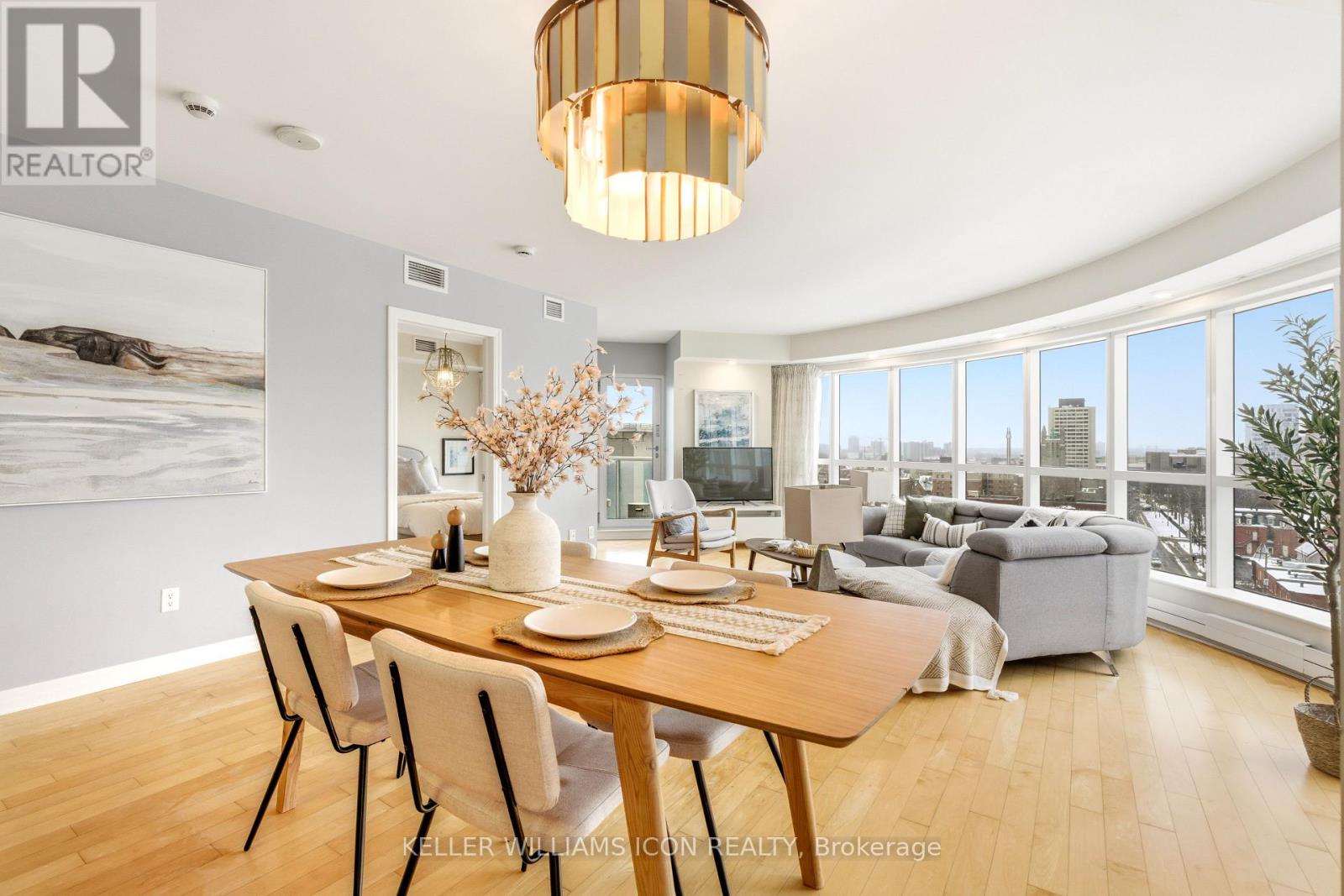Wow residence in the heart of downtown Ottawa, where distinctive curved windows wrap around the living space and fill the home with natural light while showcasing sweeping panoramic views across the city skyline. Offering approximately 1,280 sq. ft., this bright and spacious two-bedroom, two-bathroom condo features a well-designed layout with an open-concept living and dining area that flows seamlessly for both everyday living and entertaining, a modern kitchen with clean finishes and ample cabinetry, a generously sized primary bedroom, and a versatile second bedroom ideal for a home office or guest accommodation. The expansive window design not only enhances the sense of space but also creates a unique living environment rarely found in typical condo layouts. Residents benefit from a professionally managed building with 24-hour concierge, indoor pool, fitness centre, sauna, and party and meeting rooms. Located just steps to Parliament Hill, the ByWard Market, Rideau Centre, University of Ottawa, and LRT transit, this home offers exceptional walkability, strong rental appeal, and a highly convenient downtown lifestyle. (id:58075)