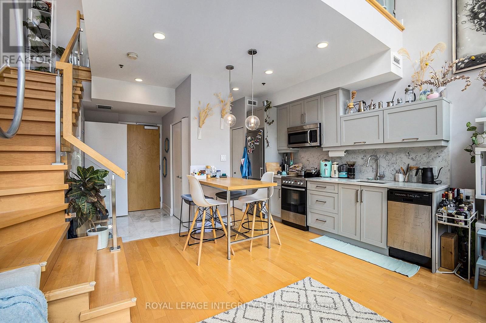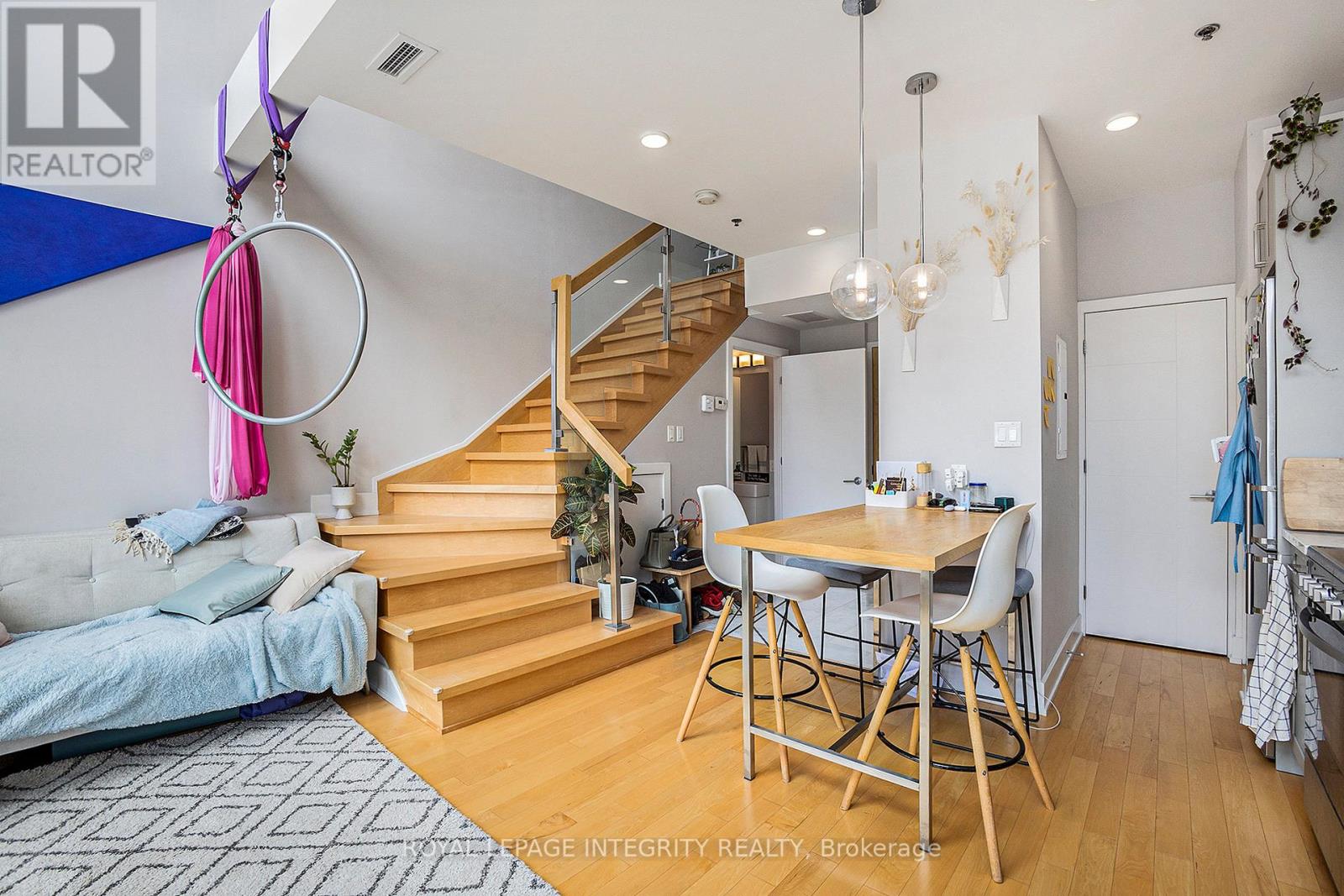 Discover stylish urban living in this 1-bedroom, 1.5-bath loft-style apartment at Tribeca Lofts. Located just one block from Elgin Street and two blocks from Bank Street, you are steps to shops, cafés, restaurants, transit, and everyday conveniences including Farm Boy, Rexall, and the Wine Shop. This south-facing unit is bright and open with floor-to-ceiling windows (automated blinds included) and a private terrace with natural gas hookup for BBQs. The main level features a spacious entry, powder room, laundry and utility room, living area, and a modern kitchen with quality finishes. The upper loft area includes a large bedroom space with room for a desk, a walk-in closet, and a four-piece ensuite bathroom. Building amenities include an indoor pool, gym, sauna, party room, and two rooftop terraces. One storage locker included. Parking available to rent in the building for approximately $150/month. Tenant pays Hydro, Hot Water Tank Rental, and Internet/TV (if applicable). Photos were taken prior to the current tenancy. BOOK YOUR SHOWING TODAY! (id:58075)