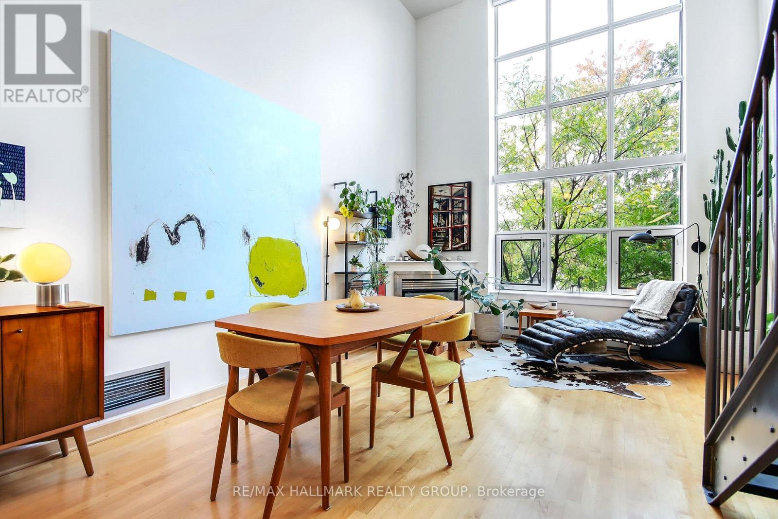 Stunning loft living in this beautifully built Charlesfort boutique condo building, designed by Barry Hobin in Old Ottawa East. The main level hosts open concept living and dining with remarkable windows, 17-foot ceilings, and a cozy living room area. With the high ceilings you can enjoy ample wall space for your art display! The master chef kitchen includes 5 stainless steel appliances; fitting for dinner parties and entertaining day and night. The upper level features a loft bedroom space overlooking the main level living spaces, laundry and a full bath. One parking spot and access to roof-top balcony with community BBQs. 24 hours notice for Showings and 48 hours irrevocable on offers. (id:58075)