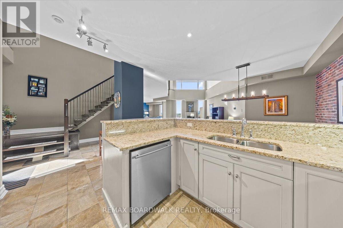 Welcome to the Penthouse at The Opus - where exceptional square footage meets sophisticated downtown living. Square footage of this scale is nearly impossible to find in today's condo market! This rare offering has 2250+ sq. ft. of bright, south-facing living space. The inviting foyer opens to an impressive 2-storey living room with open riser staircase, ornamental ironwork, and floor-to-ceiling windows drawing in natural light. The open-concept kitchen features off-white cabinetry, granite counters with bar seating, excellent prep space, and clear sightlines to the living and dining areas. The dining room comfortably fits 6-10 guests, ideal for entertaining. The current living room (used as one of two home offices) includes a gas fireplace and access to a private balcony overlooking the gardens and rooftops. A second large flexible room on the main level can function as a family room, closed den, or optional 3rd bedroom. A generous secondary bedroom and full 4-piece bathroom complete this floor. Upstairs, the loft awaits, offering the best views in the home - perfect as a home office, studio, gym, or creative space. Laundry and utility rooms are conveniently located off this level. The Primary Suite includes a walk-in closet and a spacious 5-piece ensuite with soaker tub and double-sided fireplace shared with the bedroom. Ample room for a king-sized set. The unit includes one underground parking space, one locker, and two bicycle spots. Building amenities include a fitness room, party room with kitchen, library, guest suite, and five visitor parking spots. Exceptional location: seconds to the 417, two blocks from the Rideau Canal, and walking distance to both downtown and the Glebe. Urban convenience and executive elegance come together in this rare offering at The Opus. A penthouse offering true space, natural light, and flexibility - this is downtown living without compromise. (id:58075)