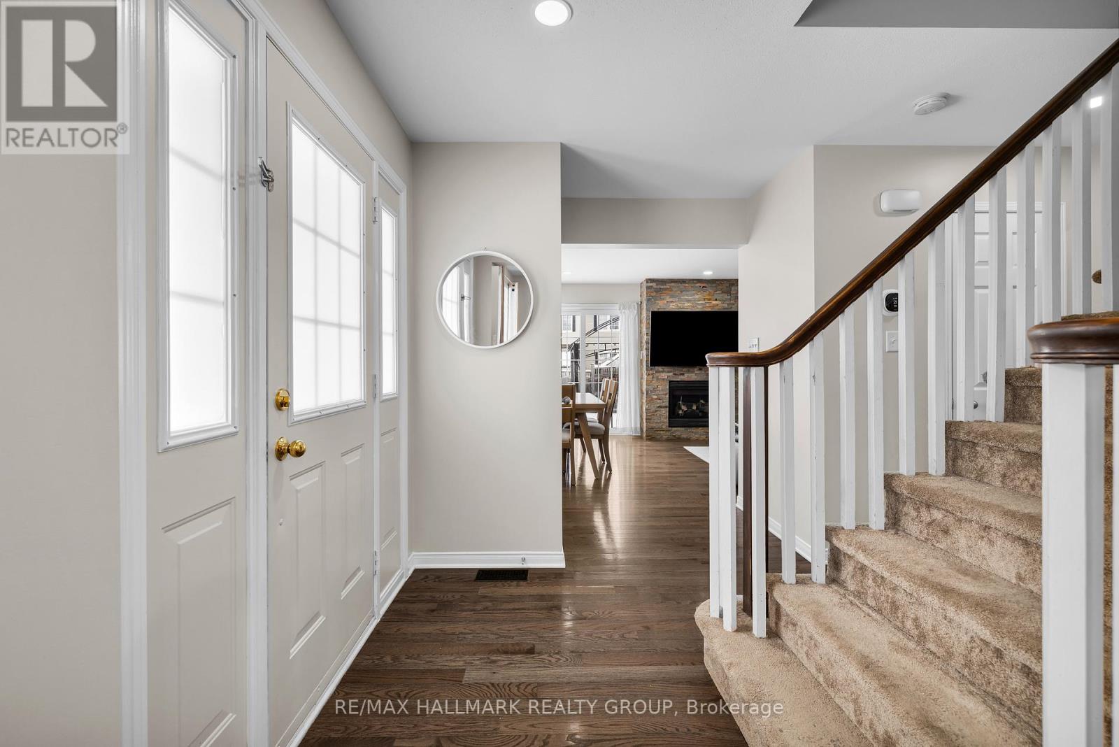 Open House, Sunday Jan 18th, 2-4 pm. End-unit townhouse with double car garage situated on a large corner lot in Stonebridge, one of Barrhaven's most sought-after, family-oriented neighbourhoods, surrounded by top-rated schools, parks, shopping, a vibrant marketplace, and everyday conveniences. This turn-key home offers a double-car garage, a fully finished basement, and state-of-the-art finishes throughout. Step inside to a spacious foyer with a large entry closet, leading to bright and open living and dining areas enhanced by hardwood floors, pot lights, and abundant natural light from oversized windows. The stunning stone-surround fireplace serves as a beautiful focal point, while patio doors open to a large, fully fenced backyard-perfect for entertaining or relaxing. The modern kitchen features floor-to-ceiling cabinetry, stainless steel appliances, a generous breakfast island, quartz counters, and sleek finishes, with a conveniently located powder room completing the main level. Upstairs, the spacious primary bedroom offers a walk-in closet and a 4-piece ensuite. A large second bedroom and a third well-appointed bedroom share a full bathroom, while a bright laundry area completes the second floor. The finished basement provides versatile additional living space, ideal for a family room, home office, or gym. Another feature of this home is the porch/verandah along the side of the house, offering the perfect spot for your morning or afternoon coffee, with a gated access to the backyard for added convenience. This is a rare opportunity to own a beautifully upgraded home in a welcoming community-move-in ready and not to be missed. (The low monthly fee includes snow removal for the private street (excluding the driveway) and exterior landscaping, including grass and hedge trimming along the fence. The roof was replaced in 2023. The second floor features new vinyl flooring with underlay, replacing the original carpeting. (id:58075)