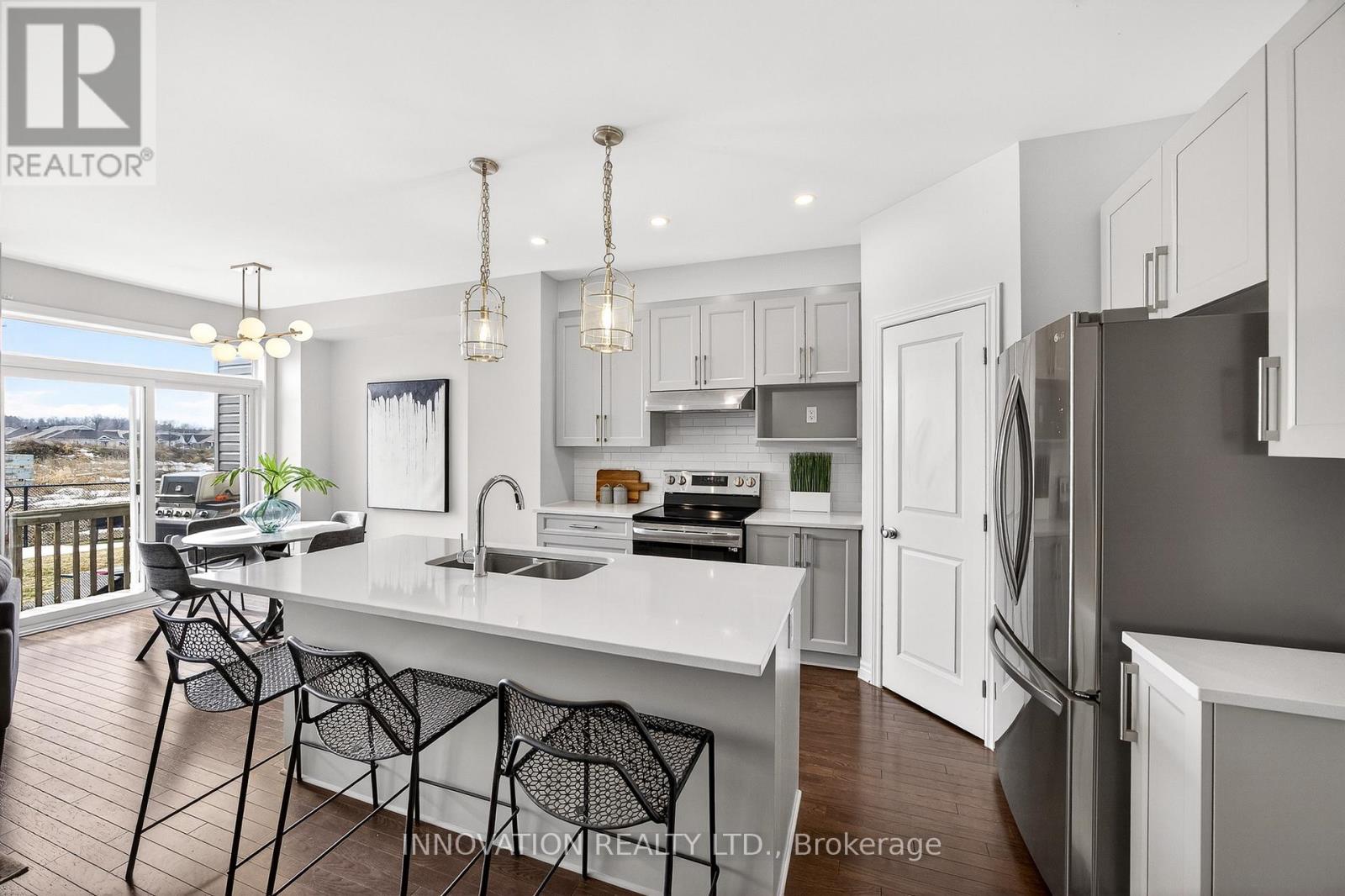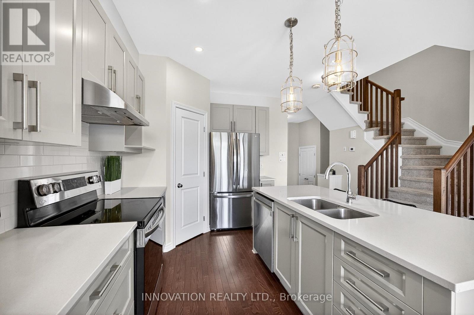 Welcome to 321 Kanashtage Terrace, a tastefully upgraded Tamarack home with NO REAR NEIGHBOURS, offering over 1400 sq. ft. of above-grade finished living area plus a finished basement in the desirable community of Cardinal Creek in Orléans-Cumberland. This spacious 3-bedroom, 2.5-bath townhome features an open-concept main level, enhanced by sprawling 9-foot ceilings, rich hardwood flooring, upgraded lighting and large south-facing windows that allow natural light to permeate the level. The inviting living and dining areas are anchored by a cozy gas fireplace with a TV-ready wall, perfect for both everyday living and entertaining.The modern kitchen is both stylish and functional, featuring bright quartz countertops, pot & pendant lighting, stainless appliances, a large island with a breakfast bar, and a walk-in pantry, offering exceptional prep and storage space. Upstairs you'll find a well-appointed layout, including convenient second-level laundry with upper cabinets. The primary suite is a true retreat, featuring a spacious walk-in closet, and a luxurious ensuite with a large soaker tub and a walk-in shower. Two additional bedrooms, a 4-piece bathroom with quartz counters and laundry complete the level, providing excellent space and convenience for guests or growing families. The finished basement adds extra living space with a large recreation room - ideal for a home theatre, gym, or play area. Additional highlights include ample storage space and a single-car garage with entry to mudroom, adding both convenience and functionality. This home backs onto a future school and is just minutes from parks, trails, shopping and everyday amenities. It's also just a short commute to the future LRT, offering excellent long-term value and connectivity. Offering an ideal blend of space, function, and privacy, this home presents an exceptional opportunity in one of Orléans-Cumberland's fastest-growing neighbourhoods. (id:58075)