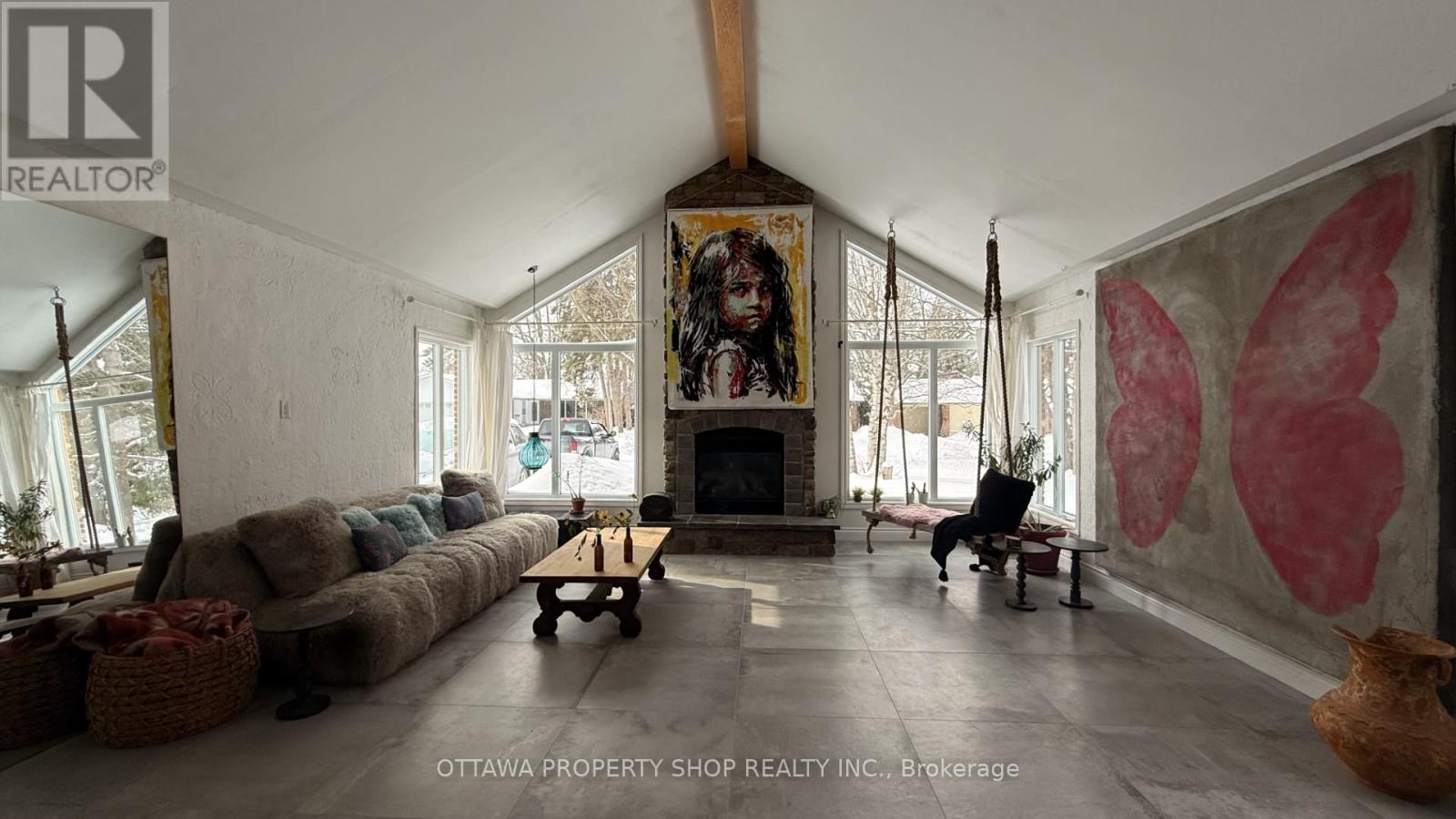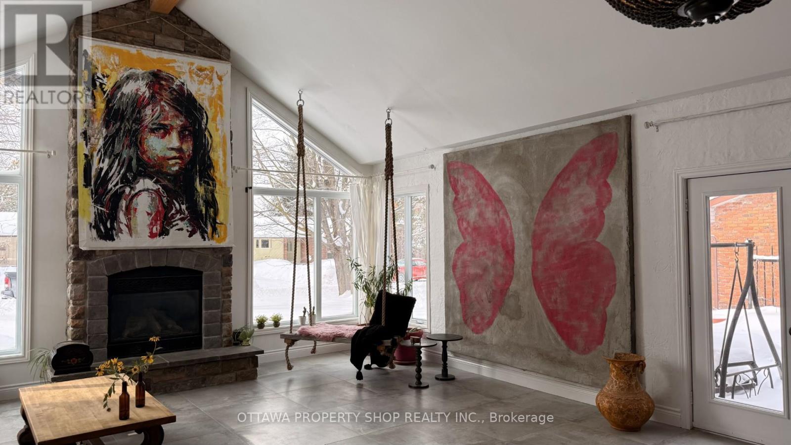 An extraordinarily rare residence in the heart of prestigious Beaverbrook, Kanata, this one-of-a-kind bungalow offers a level of craftsmanship and global elegance seldom seen in Ottawa. Originally a three-bedroom bungalow, it has been artfully re-imagined into a spacious two-bedroom (can be easily converted back to 3 bedroom) layout, plus den/office, which emphasizes flow, scale, and refined living. The showpiece of the home is the spectacular Spanish-inspired main-floor family room addition (approx. 510 sq. ft., built 2010), featuring soaring 14-foot ceilings, dramatic oversized windows, and a striking gas fireplace, creating a grand yet inviting space ideal for both entertaining and everyday luxury. Equally impressive is the massive formal dining room, complete with a wood-burning fireplace and sliding doors leading to the private backyard, offering seamless indoor-outdoor living and an exceptional setting for gatherings. The chef's kitchen is expansive and elegant, showcasing handmade stone countertops, imported French cabinetry, and timeless design that blends beauty with functionality. Throughout the home, curated finishes include imported porcelain ceramic floors from France, centuries-old palace doors from India, and handcrafted French lighting, reflecting a rare commitment to detail and authenticity. Major updates such as roof, windows, and furnace provide modern comfort and peace of mind. Set on a fully fenced, private backyard, this home offers tranquility within one of Ottawa's most established neighbourhoods, moments from public transit, shopping, schools, golf courses, parks, and fine dining. A truly distinctive offering-this is not just a home, but a statement of timeless luxury, character, and world-class design. (id:58075)