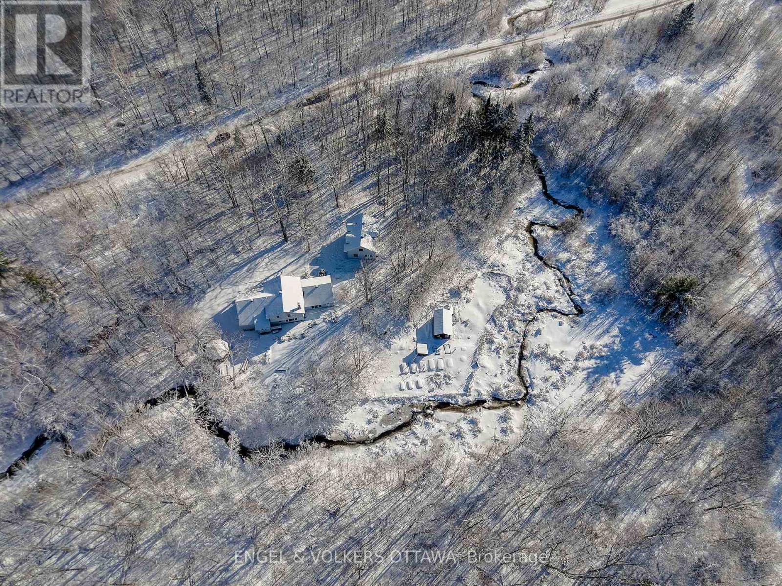 Set well back from an already quiet road, this 6-acre Dunrobin property offers a rare kind of privacy, fully treed, with a creek running through the backyard and nothing but forest around you. It's the kind of setting that feels remote, but isn't, just 15 minutes to March Road shopping, including the March Rd McDonald's and nearby retail. Country living, without the friction. The home has been thoughtfully updated and exceptionally well-maintained. Fresh paint and new flooring carry throughout, with natural light pouring into every level. A front office just off the entry offers a practical work-from-home setup. The main living space is warm and inviting, anchored by a wood-burning fireplace, exposed beams, and large windows that bring the outside in. The kitchen features quartz countertops and a unique eat-in pocket, perfect for a built-in diner-style booth or casual table setup. The layout is generous, with 4 bedrooms, 3 bathrooms, a recently updated ensuite, plus a massive dedicated gym space. Big-ticket items are handled, roof 4 years, furnace, A/C, and hot water tank 5 years, baseboard heating converted to central air, oil converted to propane and a reverse osmosis water system. The unfinished basement offers excellent storage now, with clear potential to be fully finished down the line. Outside is where this property really separates itself. A large deck spans the rear of the home, anchored by a substantial gazebo with a newly redone roof, ideal for entertaining or just slowing things down. Gardens, a chicken coop, and open usable land blend into the surrounding forest. Above the detached 3-car garage, the 1-bedroom loft with its own kitchen offers flexible space ideal for a teen retreat, guest suite, or creative use like a studio or woodworking space. Previously generating approximately $1,000 per month, it's there if you want the income or simply the added versatility. (id:58075)