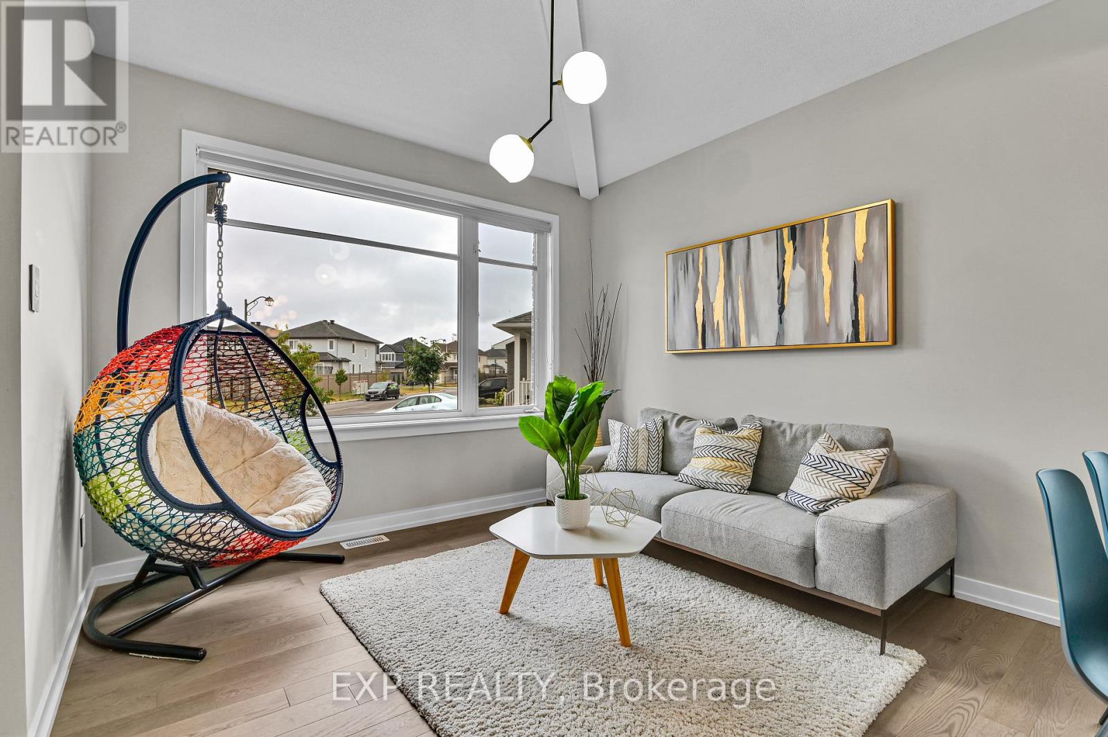 Located on a quiet crescent in the sought-after Blackstone community, this stunning Ridgecrest model by Cardel Homes offers a thoughtfully upgraded 4-bedroom + den, 3.5-bath layout designed for modern living. The main floor boasts a large private office, perfect for remote work or study, a formal dining room, and a bright living room with soaring 19-foot ceilings and a sleek fireplace. The chefs kitchen is equipped with high-end appliances built-in double oven, microwave, and induction cooktop paired with acrylic cabinetry, soft-close drawers, and lift-up panels. The oversized Britannia quartz island with bar seating, walk-in pantry, and butlers pantry offer both style and functionality. Upstairs, four generously sized bedrooms with 9-foot ceilings provide comfort and space for the whole family. The finished basement also features 9-foot ceilings and includes a spacious recreation room, kitchenette with granite countertops and mini-fridge, and a stylish 3-piece bathroom. Enlarged windows, insulated vinyl flooring, ceiling insulation, and rough-ins for a projector and speakers create an ideal entertainment space. A dedicated storage room adds even more value with a radon mitigation system, humidifier, central vacuum, large chest freezer, and organized shelving. Set on a premium pie-shaped lot with NO REAR NEIGHBOURS, this home backs onto a quiet section of a neighbourhood park offering both privacy and a serene backdrop. Additional highlights include a garage roughed-in for EV charging and beautifully selected finishes throughout. This is a rare opportunity to own a modern, move-in-ready home in one of Ottawas most desirable neighbourhoods. (id:58075)
