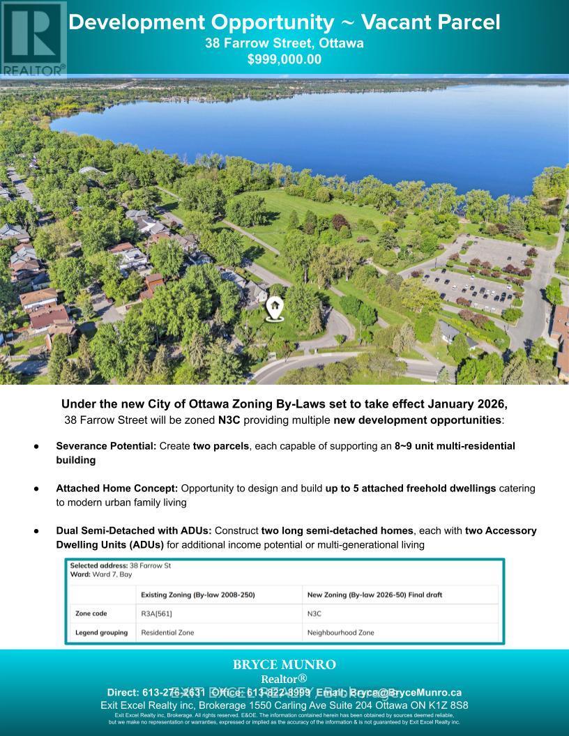 Rare development opportunity in Ottawa's west end! 38 Farrow Street sits on a generous lot offering strong potential under both current R3A zoning and the new 2026 Final Draft By-Law N3C, scheduled for adoption January 2026. The updated framework expands density permissions, simplifies setbacks and allows broader housing forms. Options include potential to sever the parcel into two developable lots, each capable of supporting multi-unit buildings of up to 8, possibly 9 units, or alternatively up to 5 attached homes with stunning views from potential rooftop terraces across the property. Located within an established residential community near transit, parks & amenities, this site is ideal for infill developers or investors seeking to capitalize on Ottawa's next wave of growth. See attached property flyer for full zoning details and development scenarios. (id:58075)