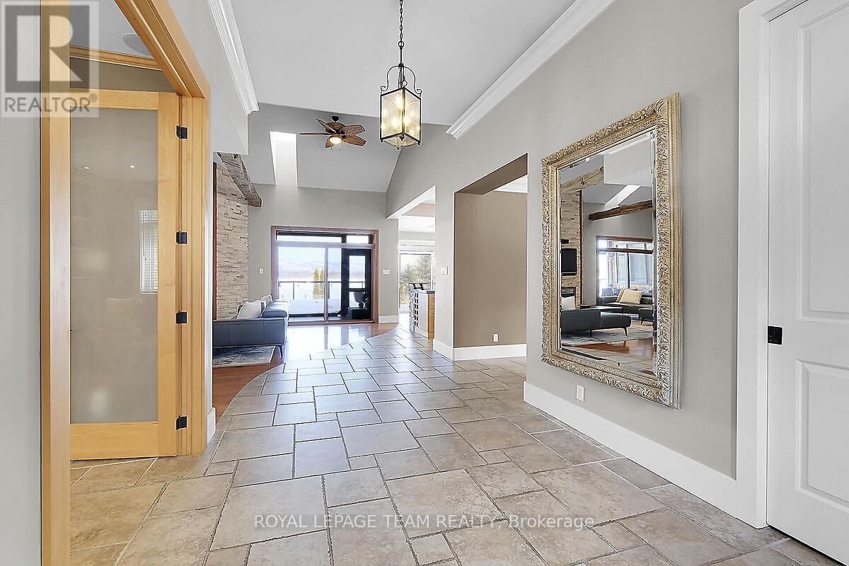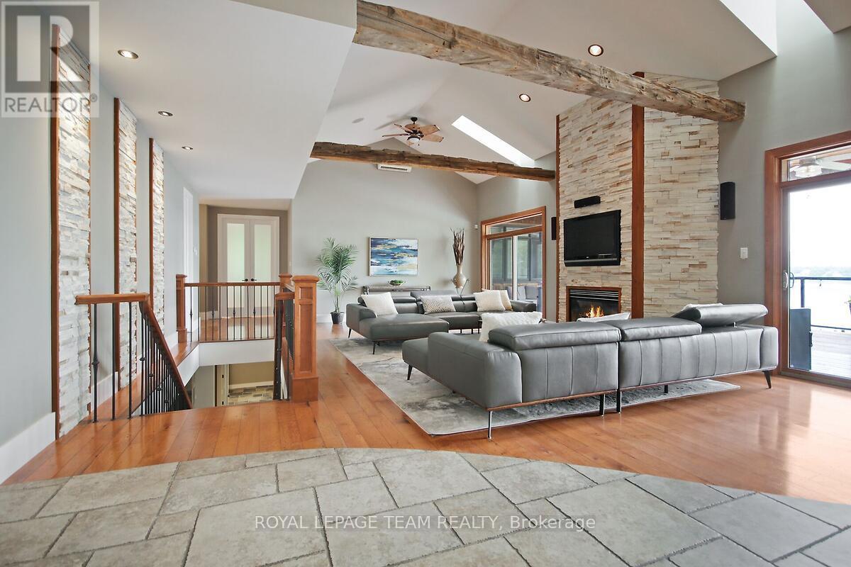 This gorgeous 5 bedroom, 3 bathroom waterfront home is truly one of a kind. Enter into the foyer and immediately be taken away by the breath taking views of the hills across the stunning waterfront. The foyer opens up to the spectacular living room featuring a fireplace, 2 skylights and 2 large sliding doors leading out to the screened in deck. This grand living room is open to the eat-in kitchen featuring stainless steel appliance, built in wine racks, ample cupboard space and an addition sliding door leading out to the massive deck. On the main level you will also find the incredibly spacious primary bedroom featuring a walk-in closet, 4 piece ensuite, fireplace and additional sliding doors leading out to the deck. This is the perfect couples retreat in your very own home. On the lower level you will find a centrally built wet bar and home theatre, perfect for entertaining, along with addition sitting space, 4 bright bedrooms and a 6 piece bathroom. The 1800 sqft heated garage with high ceilings offers ample storage space and opportunity for car lifts. The most notable part of this one of a kind home is by far the outdoor space. Not only is the screened in deck, massive uncovered deck, and large yard a wonderful space to enjoy all to yourselves or host guests, but the in-ground infinity pool and sandy shore line is every outdoor lovers dream. Enjoy a day of boating on the Ottawa River from your very own private dock. The spectacular waterfront offers prime views of sunrise and sunset all summer long and year round sunsets that are truly remarkable. No detail was missed inside or out in the design of this stunning property. NEW IN 2025 : NEW ULTRA VOILET SYSTEM, REVERSE OSMOSIS SYSTEM, FRIDGE, MICROWAVE, WASHER, DISHWASHER,HEAT PUMPS, POOL COMPUTER, POWDER ROOM TOILET, 3 WATER SOFTENERS , new 17k BOILER & JET PUMP - ALL NEW THIS YEAR. (id:58075)
