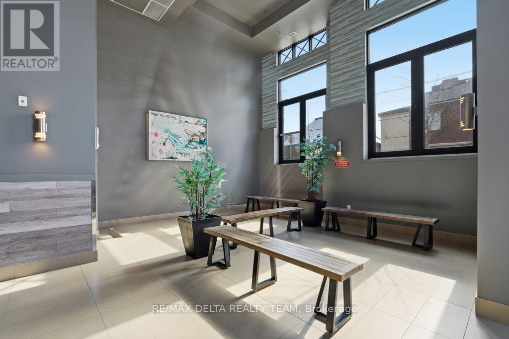 Stylish and spacious 2-bedroom, 2-bath condo in the heart of Centretown. Offering approximately 950 sq. ft. of modern living space + 50 sq. ft of balcony. This bright unit combines urban sophistication with strong investment potential. Featuring 9-ft ceilings, hardwood floors, and floor-to-ceiling windows, the open-concept layout includes a contemporary kitchen with stainless steel appliances and a moveable island - ideal for entertaining or everyday living. The primary bedroom offers double closets, a private ensuite with glass shower and dual rainfall shower heads, while the generous second bedroom and nearby full bath provide excellent separation - a perfect setup for students or professionals seeking their own space. Enjoy morning coffee on your covered patio or take in city views and sunsets from the rooftop terrace equipped with BBQ area. Steps to Bank Street, Elgin Street, Parliament Hill, restaurants, shops, and public transit. Easy access to HWY 417. Includes underground parking and bicycle storage. Ideal for investors, professionals, or parents seeking student accommodations near downtown universities. Condo fees cover everything except electricity. Inclusions: Hot water tank (owned) Stove, refrigerator, microwave/hood fan, dishwasher, washer, dryer, all light fixtures, window coverings, bathroom shelves, kitchen island, and bar stools. Underground Parking P1 #40. FOB building access. Citizen model with den removed to expand secondary bedroom. Measurements are from floorplan. Available May 1st. (id:58075)
