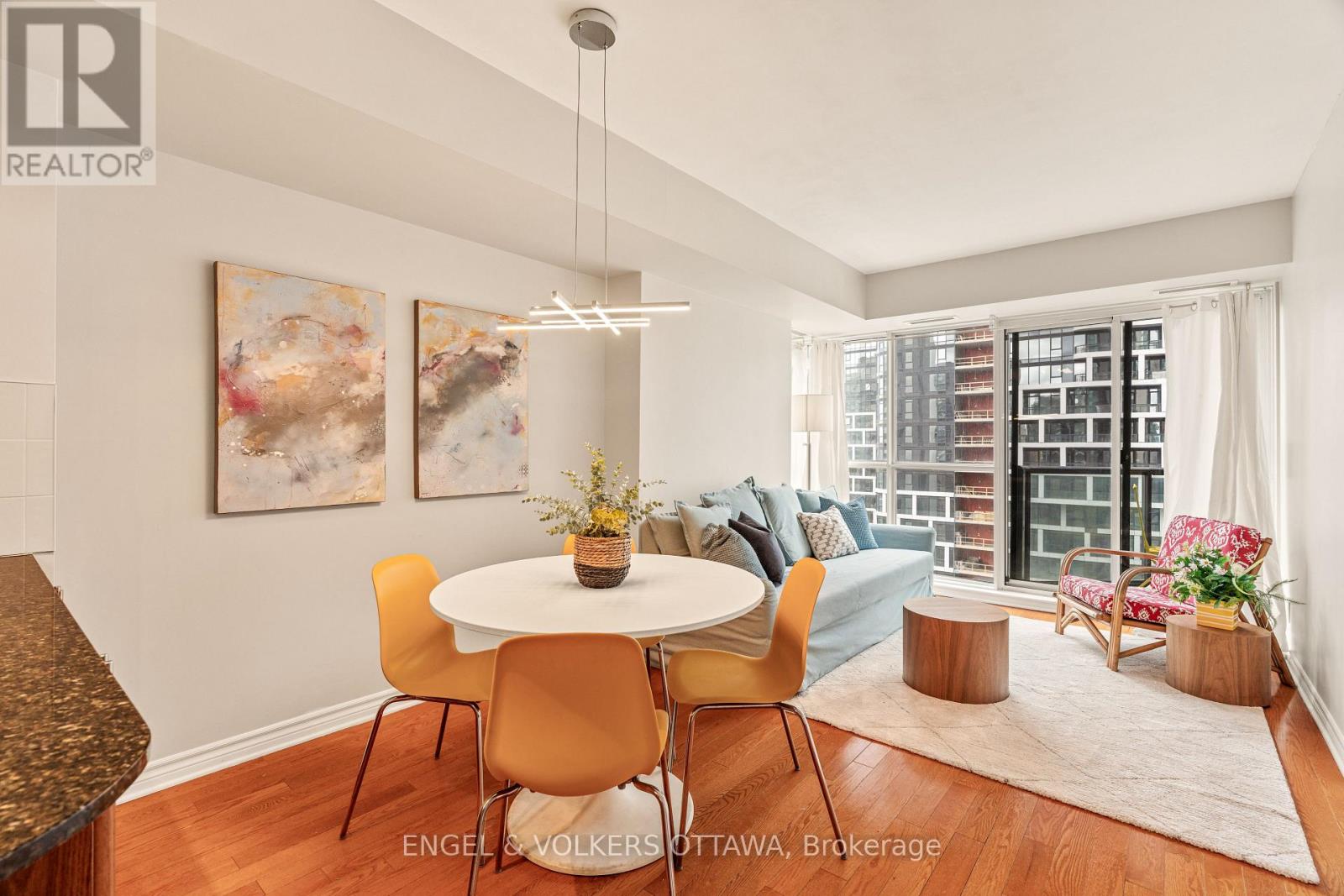Fully furnished and move-in ready - with underground parking included! This bright 1-bedroom corner suite offers 655 sq ft of thoughtfully designed living space in the heart of downtown. With floor-to-ceiling, wall-to-wall windows, the open-concept layout is filled with natural light and offers views of downtown and the future central library from your private balcony. The spacious bedroom comfortably fits a desk and includes generous closet space, making it ideal for professionals or anyone seeking a stylish, low-maintenance city pied-à-terre. Freshly painted throughout, the unit also features in-suite laundry and secure underground parking. Located just steps from Lyon LRT Station, Parliament Hill, the Bank of Canada, World Exchange Plaza, scenic walking paths, and an array of cafés, restaurants, and boutiques - this is an unbeatable location! (id:58075)