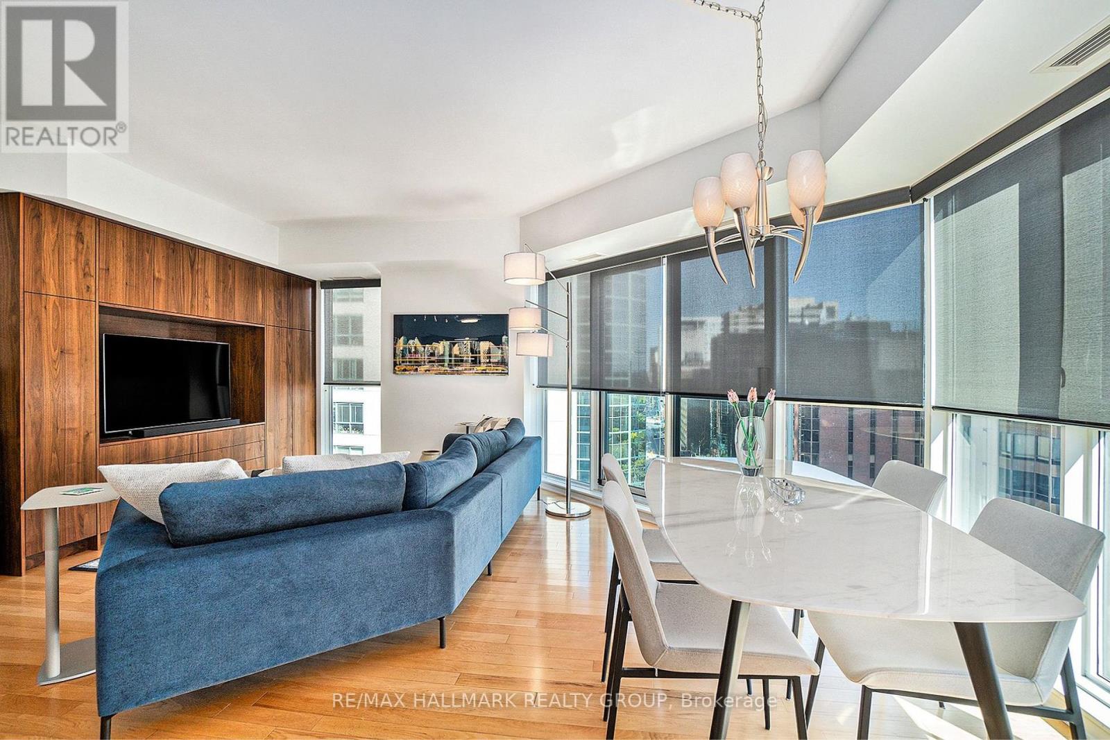Welcome to The Pinnacle, a quiet, well-kept condo building in the heart of Centretown, where comfort meets convenience. This beautifully updated 2-bedroom, 2-bathroom corner unit offers 985 sq. ft. of sun-filled living space, framed by floor-to-ceiling windows that stretch across two walls.The layout is spacious and practical, with a large open-concept living and dining area that feels airy and relaxed. The kitchen is a standout, featuring stainless steel appliances (2022), quartz countertops, a tiled backsplash, and sleek, high-grade cabinetry with plenty of storage. Hardwood flooring runs throughout the unit, and custom living room built-ins add style and function.The primary bedroom includes its own en suite, while the second full bathroom features a luxurious walk-in tub offering a spa-like place to unwind at the end of the day.Unit includes underground parking (Level 3, Spot 4A) and a storage locker (Level 2, Unit 76). The Pinnacle offers a party room, two elevators, and secure entry, with just five units per floor for a quieter atmosphere. Across the street, a community garden and park provide a peaceful green space to enjoy with your morning coffee, and the Tech Wall Dog Park is just a few blocks away. You're surrounded by top restaurants, cafes, grocery stores, and transit connections, all just minutes from your door. Quick closing available! (id:58075)