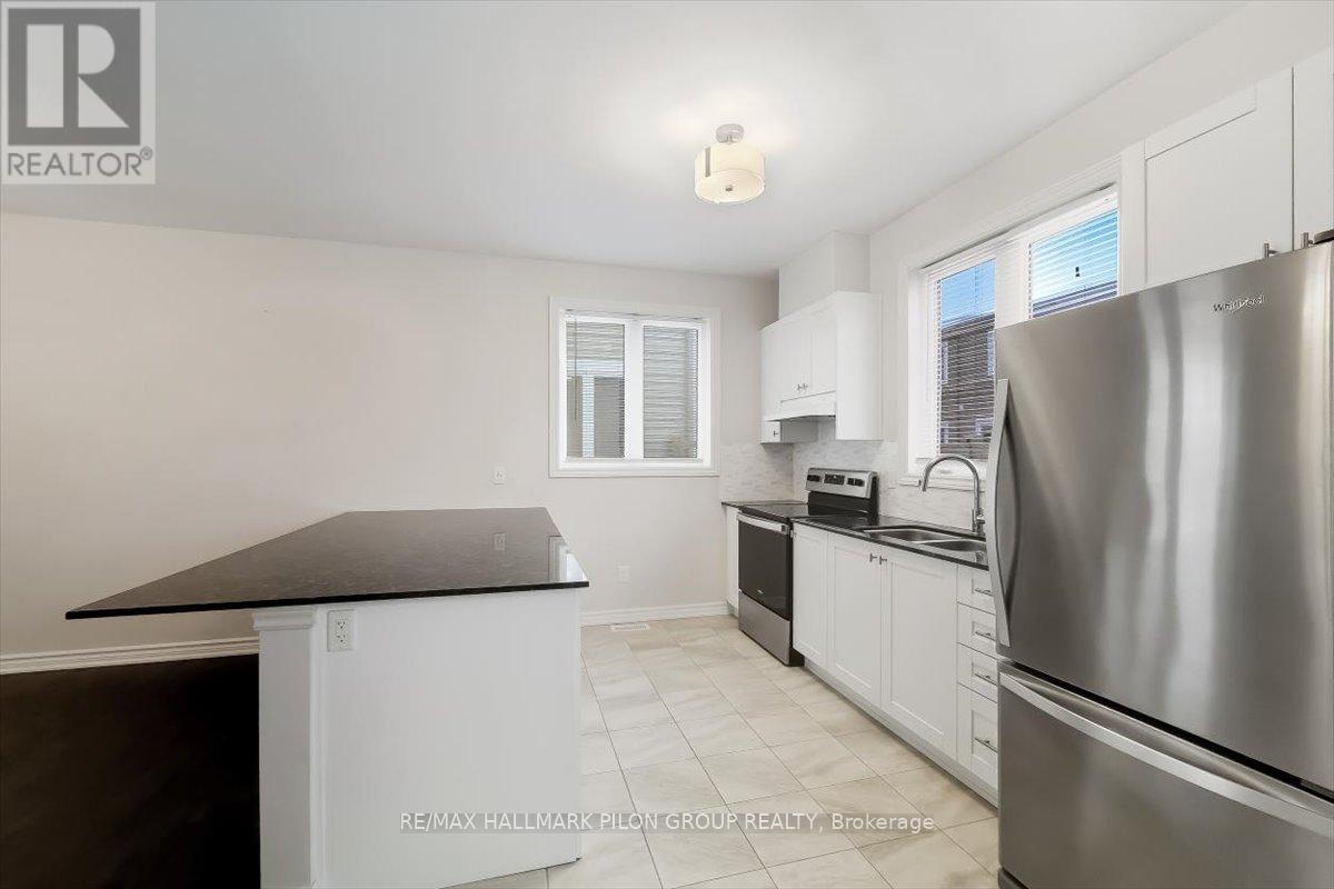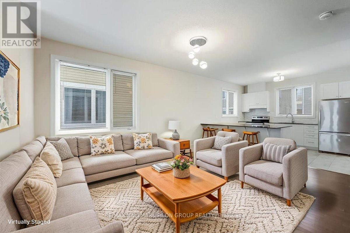 Beautiful curb appeal and a rare private driveway welcome you to this end-unit Caivan townhome, ideally located in the popular community of Orleans Village - welcome to 504 Loury Row. Step inside the spacious tiled foyer and immediately appreciate the bright, open-concept layout, filled with natural light. The inviting foyer offers a large front hall closet, a stylish powder room, and convenient inside access to the garage. Designed for both everyday living and entertaining, the generous living room features a large window and a comfortable, airy feel. The kitchen is truly the heart of the home, showcasing crisp white cabinetry, rich granite countertops, a striking backsplash, and a breakfast bar with seating - perfect for casual meals or connecting with guests. The adjacent dining room offers plenty of space for family dinners and effortless hosting. A wide staircase leads to the second level, where you'll find a serene primary retreat complete with large windows, an oversized walk-in closet, and a private three-piece ensuite. The second bedroom is equally impressive with its own walk-in closet, while the third bedroom remains generous in size, offering an oversized window and ample closet space. A neutral full bathroom completes this level.The fully finished basement adds exceptional versatility, featuring a spacious recreation room ideal for a TV lounge, home office, gym, or play area - the choice is yours. Laundry is neatly tucked away in the unfinished area, which also provides abundant storage space and a separate room with a rough-in for a future bathroom.Step outside through the patio door off the dining room to enjoy the sunny, West-facing backyard. Fully fenced and offering a large grassy area, it's the perfect space to relax or entertain during warmer months. Some photos virtually staged. (id:58075)