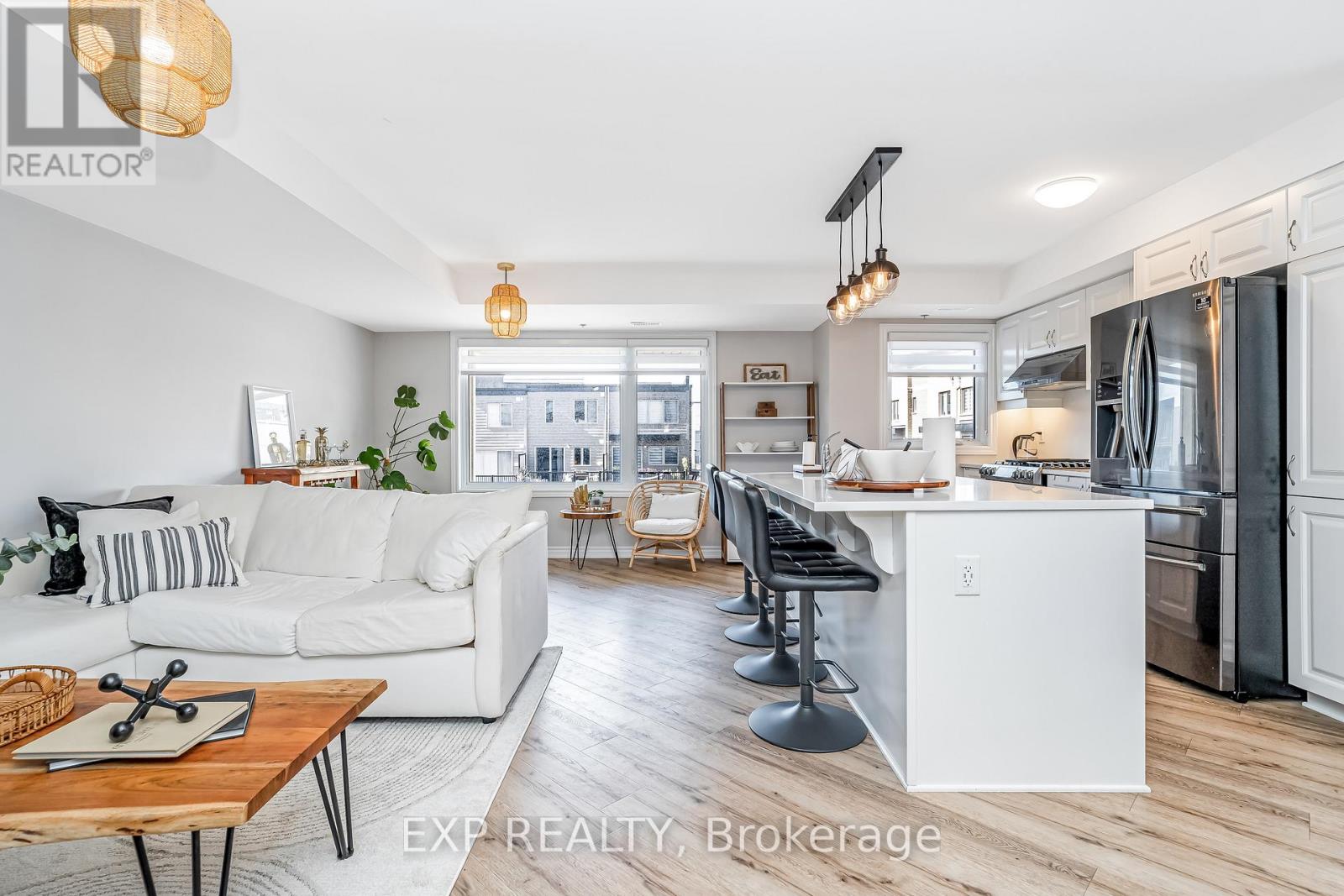 Welcome to your new happy place, a bright, modern 2019 2 bed, 2 bath upper-level corner unit in one of Ottawa's most vibrant communities. Steps from Parks, Nature Trails & Paths on Ottawa River, Montfort, CSE, CSIS, CMHC, LRT, Costco, plus just minutes to prestigious private schools: Ashbury College and Elmwood School. With over $60K in upgrades, this home features smooth ceilings, custom lighting, upgraded luxury vinyl plank flooring, and a sun-filled open layout. The kitchen shines with quartz counters, pristine white cabinetry, upgraded charcoal matching appliances, and a spacious eat-at island. Upstairs, enjoy a private balcony off the primary bedroom, a versatile second bedroom with TONS of light (perfect as gym, studio, office or warm bedroom), and a sleek full bath with his and hers sinks set in a quartz counter and complimentary gleaming tile work. Top it all off with your own private rooftop terrace that once you step into, the views of the skyline will make you fall in love. The terrace is ideal for BBQ socials (equipped with gas bbq hookup) , sun-soaked peaceful afternoons, or starry evenings. If you haven't been to Water Ridge Village, this will be your perfect intro. Common Element fees include: Building Insurance, Garbage Removal, General Maintenance and Repair, Landscape, Management Fee, Reserve Fund Allocation, Snow Removal (id:58075)