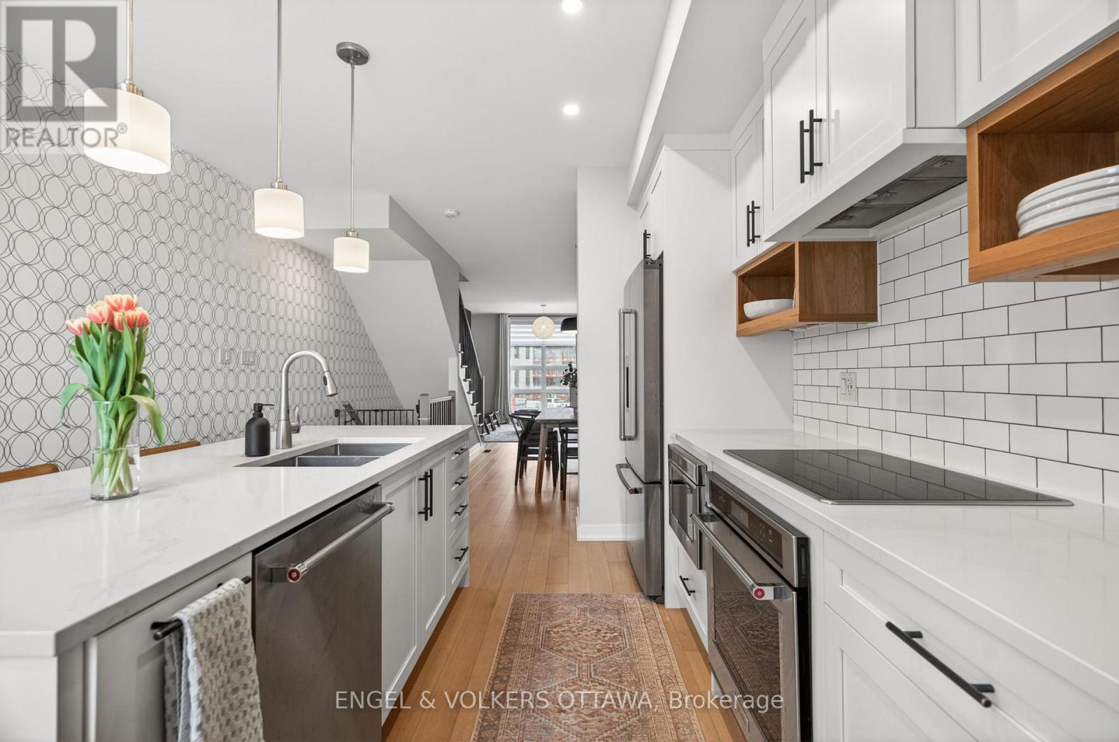 Welcome to 55 Oblats Avenue in the heart of Greystone Village, Old Ottawa East - where modern design meets an exceptional riverside lifestyle. This beautifully upgraded home offers a bright, open-concept layout with clean lines and large windows that fill the space with natural light. The main living area flows seamlessly into a thoughtfully enhanced dining space featuring custom cabinetry, a built-in bistro-style banquette, dual beverage fridges, and a statement light fixture, perfect for both everyday living and entertaining.The contemporary kitchen is designed with both style and function in mind, offering sleek finishes and ample storage while connecting effortlessly to the living and dining areas. Sliding patio door leads to private balcony with BBQ line and space for al fresco dining. The spacious primary bedroom features a full wall of custom built-in closets and a well-appointed ensuite with an extended vanity and walk-in glass shower. A second bedroom includes integrated wardrobe storage and a built-in desk, ideal for guests or a home office. The ground level features a spacious den, ideal as a family room, playroom, office, or flexible guest space. A stylish powder room is conveniently positioned near the attached garage, alongside a custom mudroom closet. The foyer also includes a built-in entry closet for added convenience. The finished basement offers valuable additional living space, currently set up as a versatile area for a home office, lounge, and compact gym. Set within the award-winning Greystone Village community, this home is steps to the Rideau River, scenic pathways, parks, and just minutes to downtown, the Canal, and all the amenities of Main Street. A perfect blend of design, functionality, and location. (id:58075)