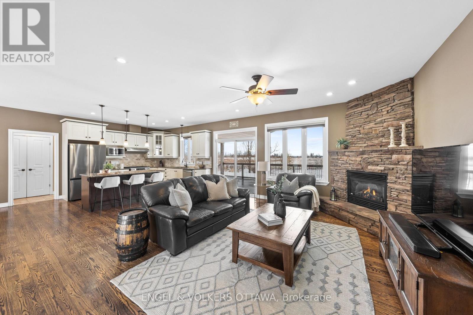 Welcome to this exceptional custom Ian Drew home, perfectly positioned on an exclusive cul-de-sac with no rear neighbours, offering privacy and refined living. Impeccably maintained, the property features elegant front landscaping with a stone walkway, raised garden beds, and an oversized paved driveway with additional side parking. Designed for elevated outdoor living, the impressive 30' x 16' covered rear deck showcases a vaulted cedar ceiling and low-maintenance composite decking, an ideal space for entertaining or relaxing in total privacy. The backyard also includes a premium storage/work shed and a RainBird 9-zone irrigation system. Inside, 9-foot ceilings enhance the open-concept living, dining, and kitchen areas, complemented by hardwood floors, granite countertops, and a cozy gas fireplace anchoring the space. The primary suite offers a spacious walk-in closet and a luxurious ensuite with a walk-in shower and soaker tub. Two additional bedrooms, one featuring a vaulted ceiling, are serviced by a full bath, while the main level is completed by a laundry/mudroom and powder room. A versatile loft provides the perfect space for a media room, home office, or additional lounge area. The lower level provides a wide-open canvas, whether for recreation, fitness, or future finishing. The oversized 3-car garage is insulated and drywalled, featuring a full rear garage door for backyard access and hot/cold water taps. Extensive mechanical upgrades include a Kinetico water system, updated hot water tank and pressure tank, and a fully serviced system with recent water testing available. A GenerLink 240V connection offers whole-home generator capability. A rare offering combining quality craftsmanship, thoughtful design, and upscale features, tailored for the most discerning buyer. Walking distance to Foodland, No Go Coffee, Red Dot Cafe and the Osgoode Link Pathway, a trail over 20 km long, connecting Osgoode to Leitrim Road and the new LRT station. (id:58075)