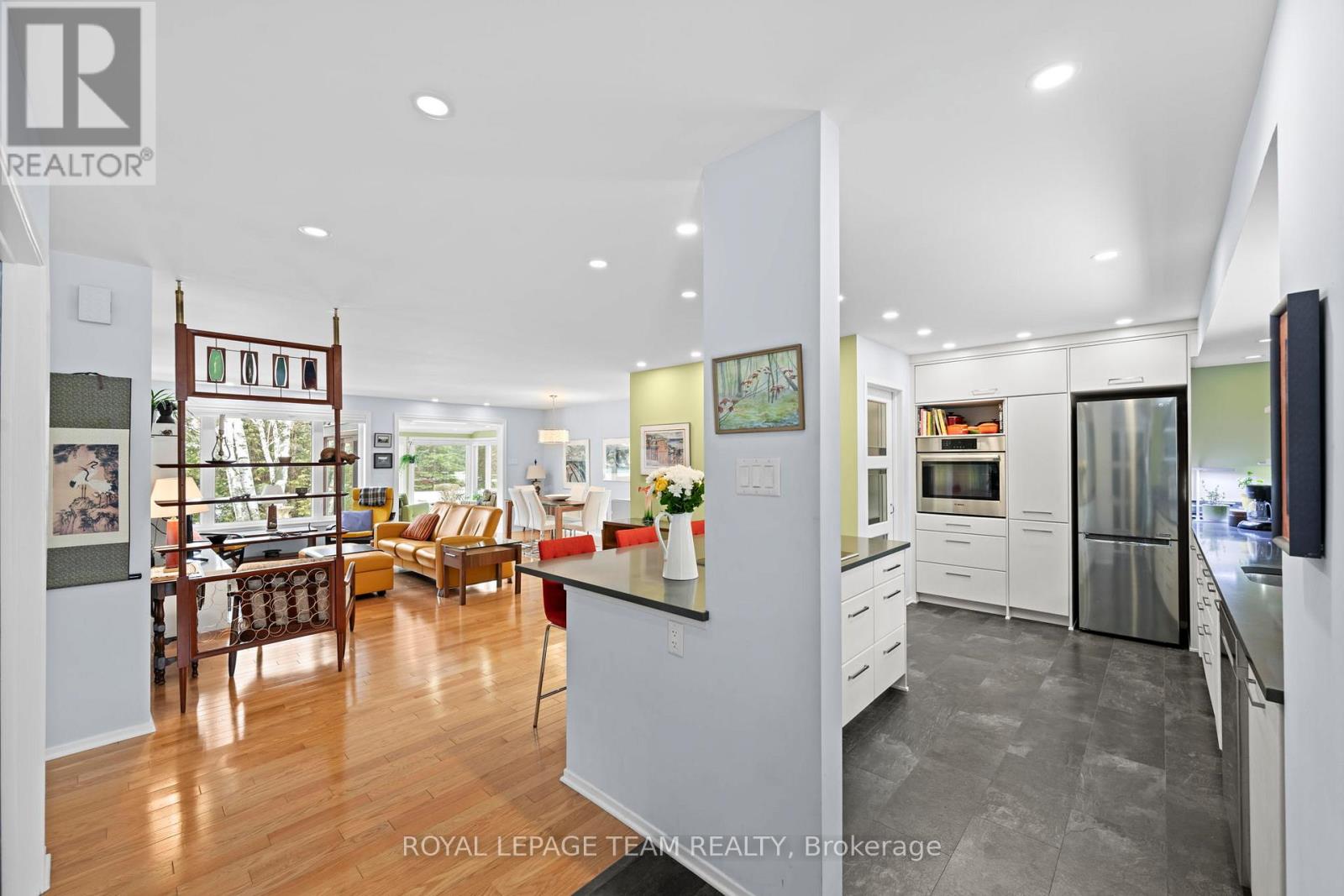 Nestled amongst the pines of Amberwood Village - executive, *end-unit* bungalow condominium uniquely renovated to an impressive standard. Beautifully finished & meticulously maintained, ideally located on a prestigious court in the quiet community in Stittsville. Enjoy excellent walkability to parks, essential shopping, restaurants & local amenities. This charming, carpet-free home features a welcoming foyer with access to true open concept living. The elegant remodeled kitchen offers ample white cabinetry, tile flooring, newer stainless steel appliances, & a generous island with quartz counters-perfect for meal prep & entertaining. A separate walk-in pantry incorporates kitchen storage & the convenient main floor laundry, & features a stylish stained glass door. The open-concept living & dining area showcases gleaming hardwood flooring, & a spectacular, integral sunroom with a door leading to the peaceful rear yard creating a cozy atmosphere. The sunroom will delight - bathed in natural light, the perfect spot for morning coffee! The spacious primary bedroom retreat overlooks the backyard with dual aspect windows. Oversized walk-in closet & full ensuite. The bright & airy bathroom boasts an upgraded large walk-in shower & ceramic tile flooring, quartz topped vanity & solar tunnel for natural light. All fully renovated! A full family bathroom, renovated to the same standard complete with natural light, solar tunnel skylight. Charming additional bedroom or den with double french doors to the foyer & elegant window seat completes this floor.The fully finished lower level includes a family room, sitting area & library section. A third fully renovated bathroom with a large walk-in shower. Storage has not been forgotten, with ample space allocated! The rear yard will not disappoint - secluded, private & peaceful with a patio area, surrounded by greenery. Two single-car detached garages crown this exceptional property. Open House Sunday, 29th March 2-4pm. (id:58075)