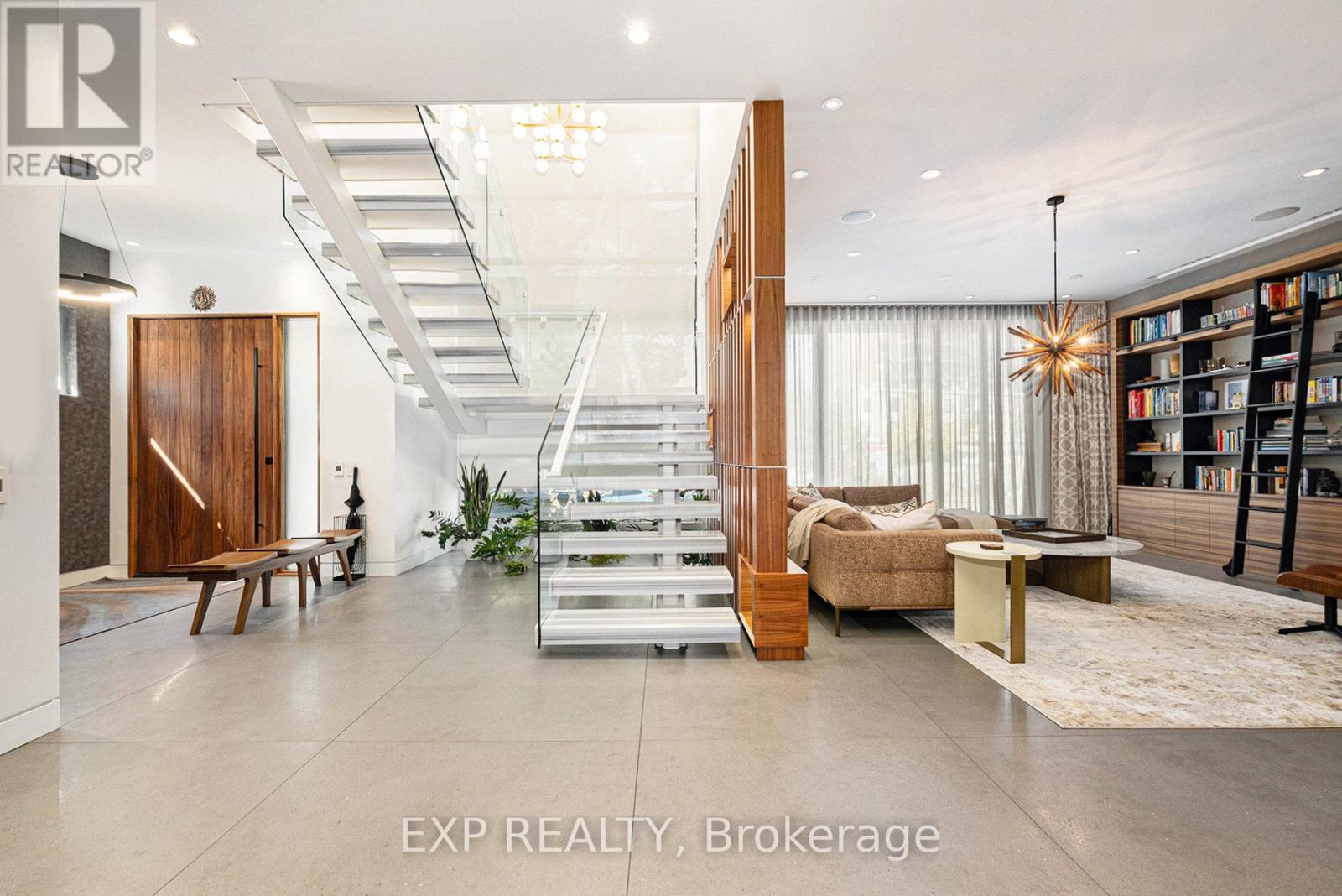 A Modern Architectural Statement in the Heart of Westboro, Reinvented Inside and Out by Style Haus Interiors & +VG Architects. The Main Level Offers 10' Ceilings & Floor to Ceiling Glass and Stunning 4'x4' Porcelain Tile. A Double Sided Linear Fireplace Anchors a Sophisticated Living & Dining Sequence beside a Custom Library Wall. The Chef's Kitchen is Newly Refreshed with Custom Cabinetry, an Expanded Island w/Breakfast Bar, Integrated Cabinet Fridges & Freezer, Sleek Push Button Upper Storage, and an Italian Coffee Bar Wrapped in Granite. A Designer Powder Room & Carefully Curated Millwork Complete this Level with Style. Open Riser Stairs with Imported Marble lead to a Serene Primary Retreat featuring Custom Built-Ins, and the Spa Caliber Ensuite includes a Full Glass Enclosure, Roberto Cavalli Tile, a Curbless Shower & Extended Double Vanity. Secondary Bedrooms are Generously Scaled. The Children's Bath Showcases a Playful Banksy Tile. An Upper Loft & Den w/Balcony, add Flexible Living Space. The Lower Level extends the experience with a Media and Games Area, Full Bath, a Well Organized Laundry RM with Folding Table & Built-Ins, and a Mudroom Reimagined with Custom Millwork Cubbies. Professionally Finished Oversized Garage for Clean Storage and Everyday Practicality. A Heated Driveway & Heated Front Walkway and Steps, Served by a New Boiler in 2024, provide Effortless Four Season Living. Outdoors, Walls of Glass open to a Landscaped Setting with Covered Transitions from Inside to Out, Perfect for Quiet Morning Coffee or Evening Gatherings. A whole home Generac Generator adds Peace of Mind. This Location is Exceptional. The Byron Linear Park Farmer's Market runs every Saturday from May to October and is Literally at your Doorstep! Westboro Beach is an Easy Bike or Stroll. The LRT Station is a Comfortable Five to Ten Minute Walk. Top Ranked Elementary and Secondary Schools are in the Catchment. Cafés, Restaurants, Grocers, and Boutique Shops are Just Steps Away! (id:58075)