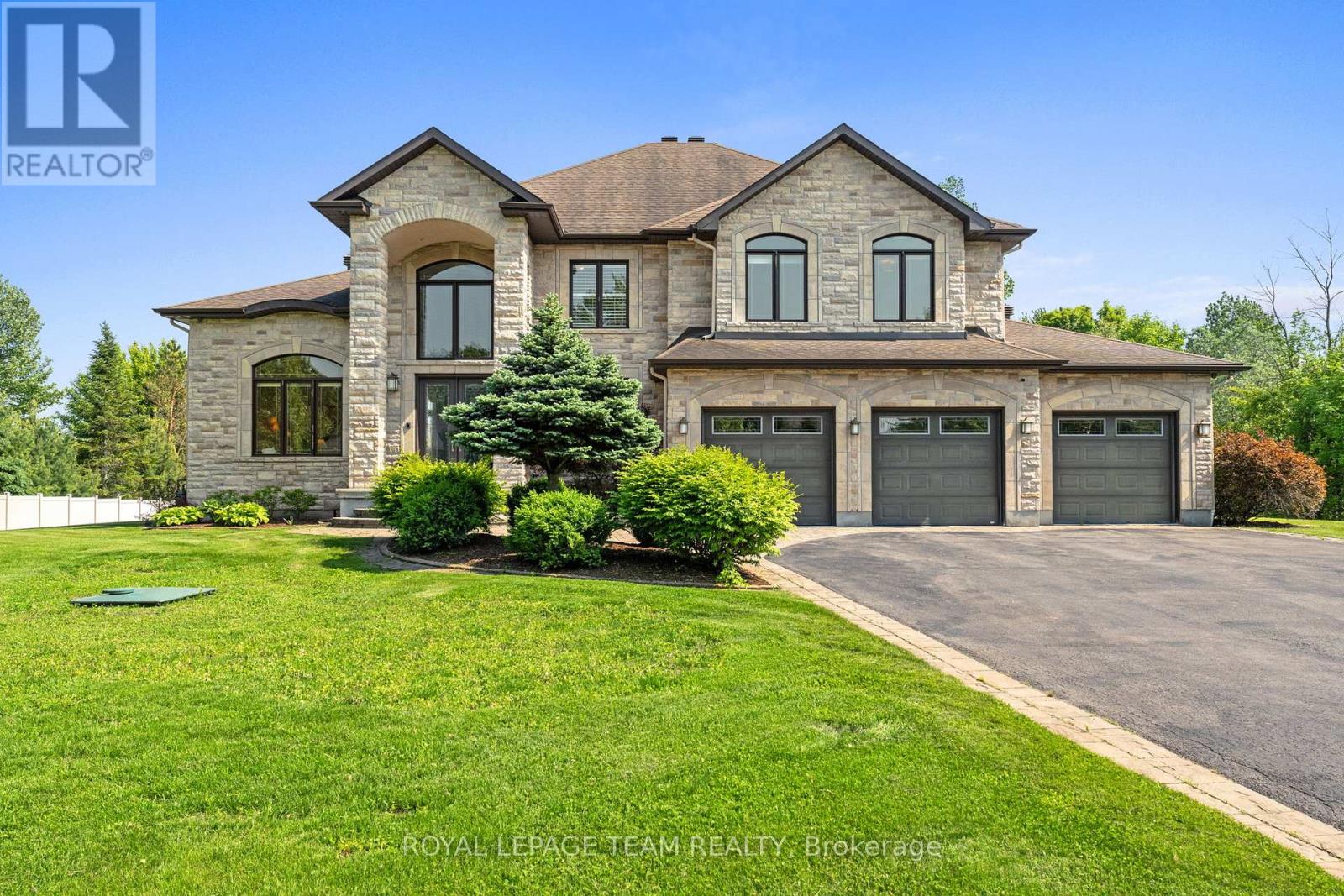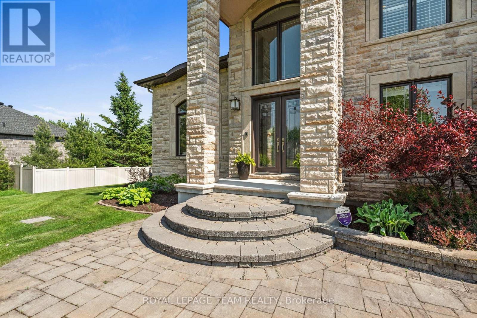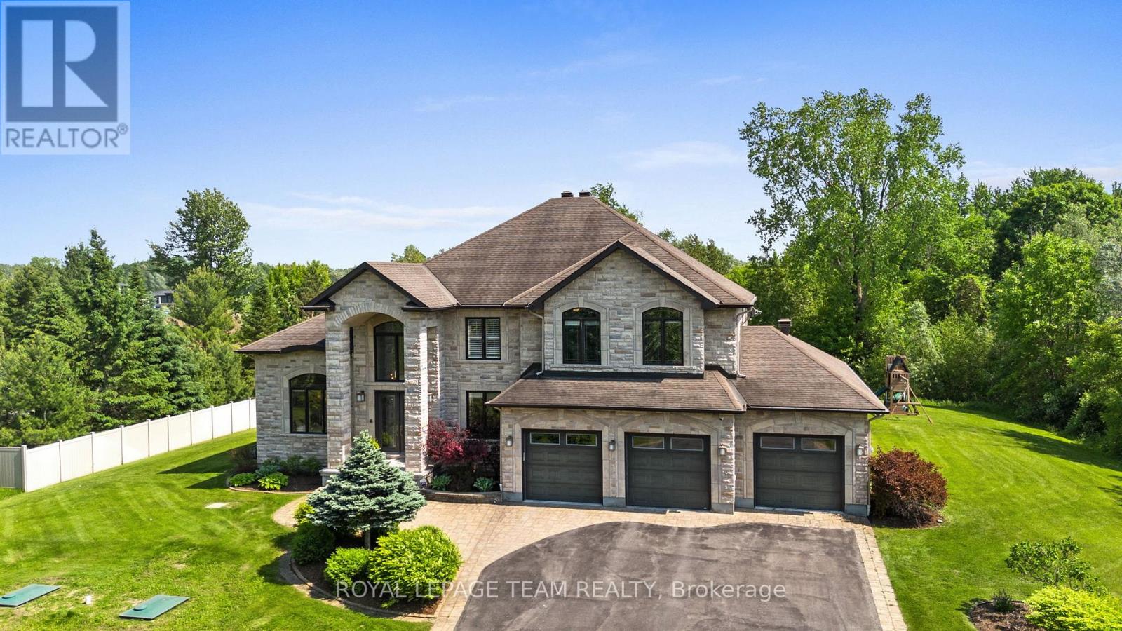 Set in the desirable Emerald Links community of Greely, this beautiful two-storey estate is thoughtfully designed for exceptional family living. Surrounded by natural beauty and just ten minutes from the shops, restaurants, and cafés in the village of Manotick, the location offers a quiet, scenic setting with convenient access to amenities. The home is only steps from the Emerald Links Golf Course and close to the Osgoode Link Trail, a popular route for biking, jogging, and cross-country skiing. This home makes an immediate impression with its striking curb appeal and a designer-finished interior that flows seamlessly through generously sized rooms. A two-storey foyer sets the tone, showcasing elevated coffered and tray ceilings, a spiral staircase, rich hardwood floors, and expansive windows with arched transoms that frame views of the surrounding landscape. At the heart of the home, the Spanish-inspired kitchen is ideal for entertaining, featuring two large islands, two-toned floor-to-ceiling cabinetry, granite countertops, a walk-in pantry, and premium appliances. The main floor also includes a dedicated office, a family room with a cozy fireplace and custom built-ins, and a sunroom complete with a fireplace and views of the backyard. Upstairs, four spacious bedrooms await, including a sophisticated primary suite with a two-sided fireplace, a stone feature wall, a spa-like ensuite bathroom, and a walk-in closet. The finished lower level extends the living space with a recreation room, versatile family areas, a secondary bedroom, flex room, and a full bathroom. Outdoors, the backyard extends the living space and is designed for both entertaining and everyday enjoyment. A spacious patio overlooks the landscaped grounds, while mature trees create a natural and private backdrop. (id:58075)