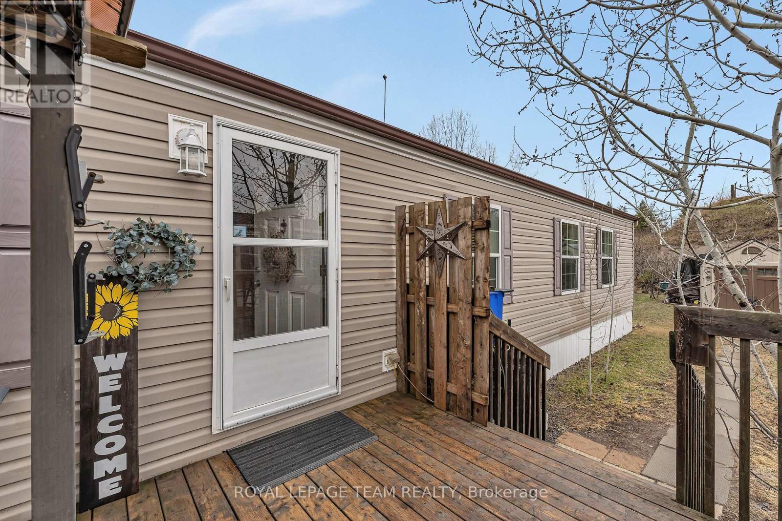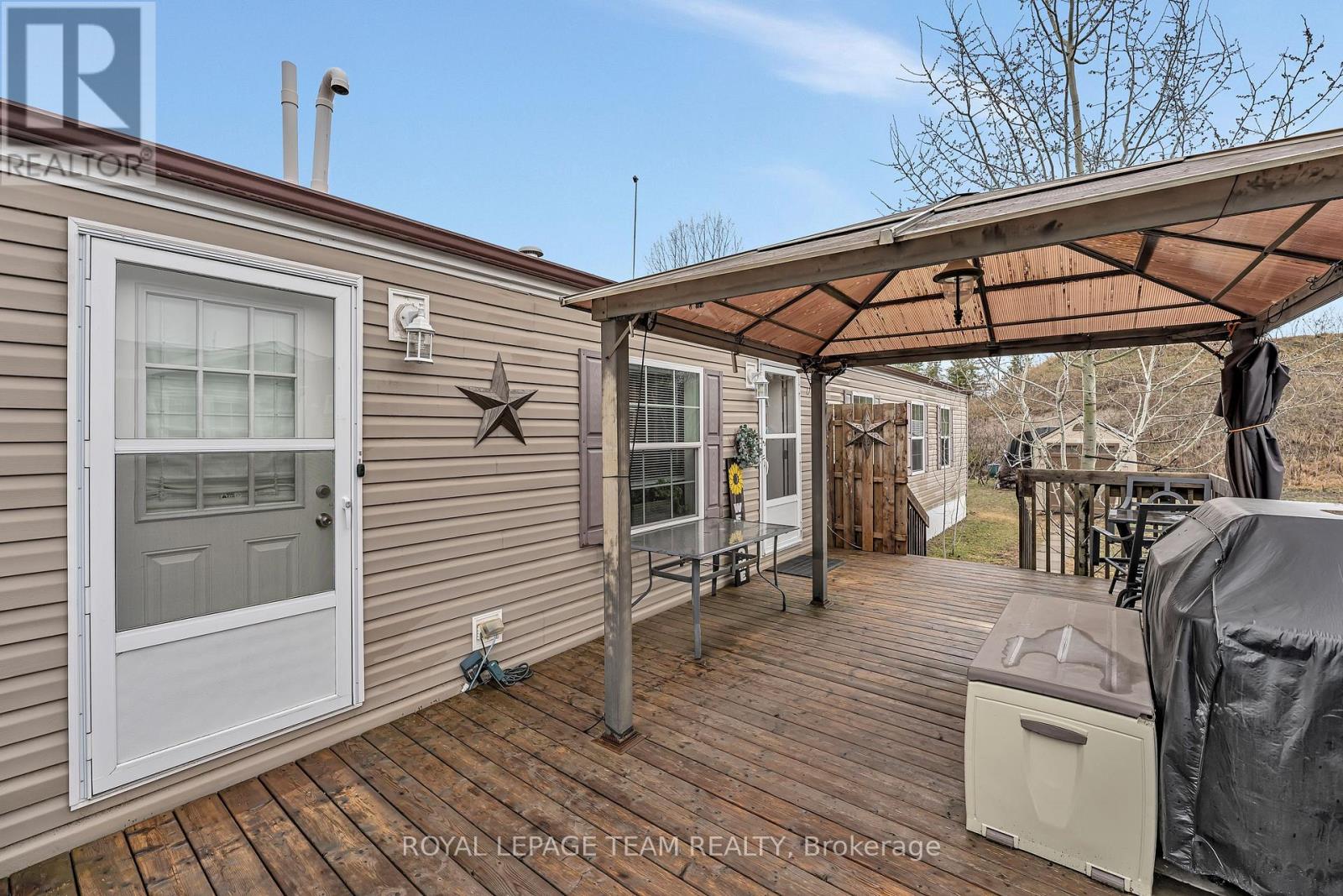 This meticulously maintained modular home built in 2013 is located in a fabulous, quiet, safe, picturesque, much sought after neighborhood in Greely & only minutes to all the amenities in Greely, Manotick, & Metcalfe! Located towards the end of the street it offers privacy & NO REAR NEIGHBORS. Vaulted ceilings, large picture windows & your south facing exposure ensure a bright home filled w/ natural light! Laminate & vinyl flooring throughout the home - NO CARPETS! This model is UNIQUE & rarely offered providing Two Bedrooms & 2 Full Bathrooms - both at opposing ends of eachother in the home - each w/its own potential front door for entry! This is an ideal set up for those with an older child, a relative, a caregiver or for those who wish to 'rent out a room' or have a private spot for family & guests when they visit! The eat-in kitchen is large & bright w/numerous wood cabinets & counter space. Included are newer stainless steel appliances including a refrigerator, 5 burner gas stove & built-in microwave/hood fan. The living room is cozy & bright w/the spacious primary bedroom conveniently adjacent. The primary suite includes a walk-in closet & a 3 piece ensuite bath! The second bedroom - at the far end of the home - is also generously sized w/tons of closet space, a big, bright window & its own 3 piece ensuite bath! The laundry/mud room is conveniently located by the 'first' front door & included are the newer, high end washer & dryer. There is a large deck w/ fencing & a lovely gazebo for your entertaining needs. The large driveway allows for 4 vehicles. A convenient storage shed & soft cover shed is included. Numerous upgrades include Central Air Conditioner, Eaves Trough, Large Deck & an owned Electric Hot Water Tank. Association fee of $568.22 per month includes property taxes, land lease, water, septic maintanance, private road maintanance & snow removal. Additional chattels may be included. A great home, great price, great hood! ~WELCOME HOME~ (id:58075)