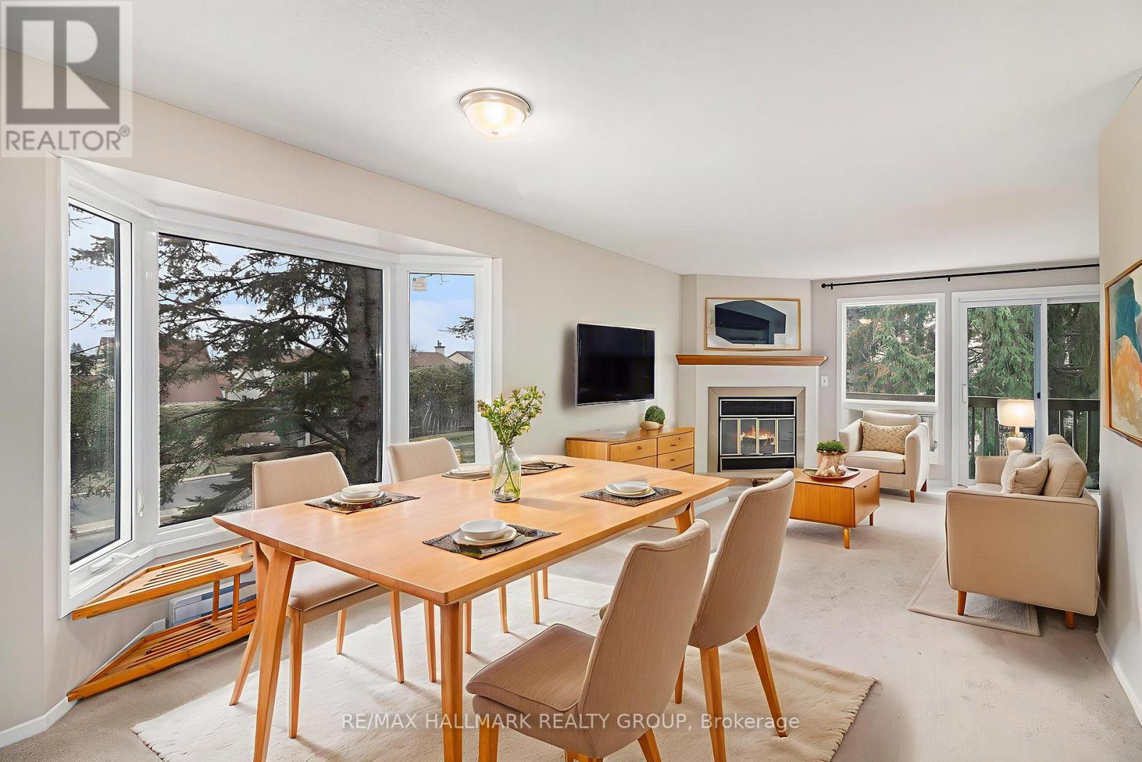 Well maintained, end-unit 2-bedroom, 2 bath upper terrace condo offering a bright interior in a peaceful, forest-backed setting of Convent Glen. The main level features an open-concept living/dining area with a cozy wood-burning fireplace and access to a private balcony with tranquil green-space views. A sun-filled eat-in kitchen and convenient powder room complete the main floor. Upstairs you'll find a sky light over the staircase & upper hallway, spacious primary bedroom with wall-to-wall closet space and its own private balcony, a bright second bedroom, full bathroom, and in-unit laundry/storage area. Newer carpets on the upper level, newer full sized washer/dryer and freshly painted throughout. Located steps from parks, playgrounds, transit, shops and the Ottawa River pathways, with easy access to Place d'Orleans, Petrie Island Beach and the LRT station. A perfect low-maintenance home in a highly desirable, nature-surrounded neighborhood. (id:58075)