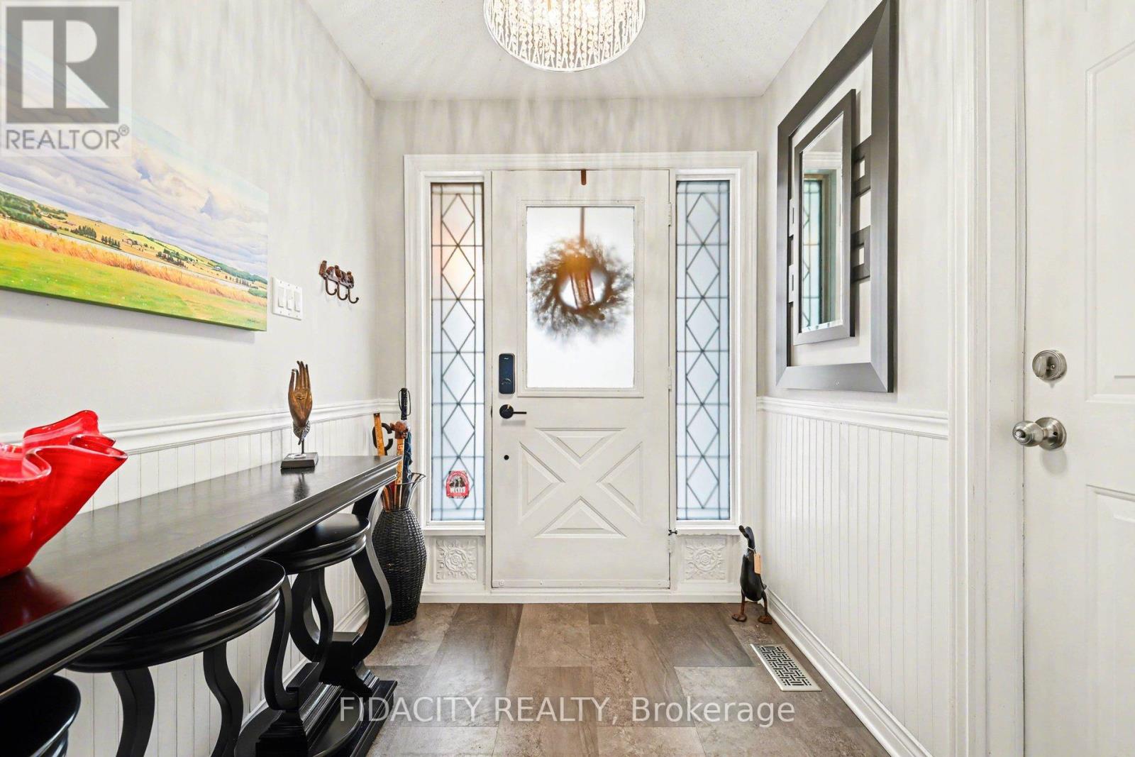 Fully renovated bungalow with walkout basement located in a mature neighbourhood with no rear neighbours. The backyard is a private oasis with mature trees and established gardens, creating a peaceful setting.The main floor is bright and welcoming with a spacious living and dining area finished with high-end vinyl flooring throughout - no carpeting. The fully renovated kitchen (2020) features quartz countertops, Spanish tile backsplash, stainless steel appliances, a large island and breakfast bar, and direct access to a raised deck overlooking the backyard-perfect for entertaining or relaxing outdoors.The primary bedroom is generously sized and includes a walk-in closet and a unique semi-ensuite bath layout featuring a soaker tub and vanity, with a separate adjoining area that includes an additional vanity and shower for added functionality.The fully walkout lower level is bright and sunny offering excellent additional living space with a dramatic two-storey family room and fireplace, plus access to an enclosed porch that opens in the summer to enjoy fresh air and breezes. This level also includes 2 bedrooms, a full bathroom, laundry area, and ample storage, with potential for a 4th bedroom or an in-law suite thanks to the bright walkout design. Meticulously maintained and thoughtfully updated throughout.Major updates include: fully renovated kitchen and new appliances (2020), vinyl flooring throughout (2020), downstairs bathroom remodel (2021), new patio door (2021), 9 new windows (2024), driveway repaved (2023), exterior repainted (2025), furnace and water heater (2016), and A/C (2017). (id:58075)