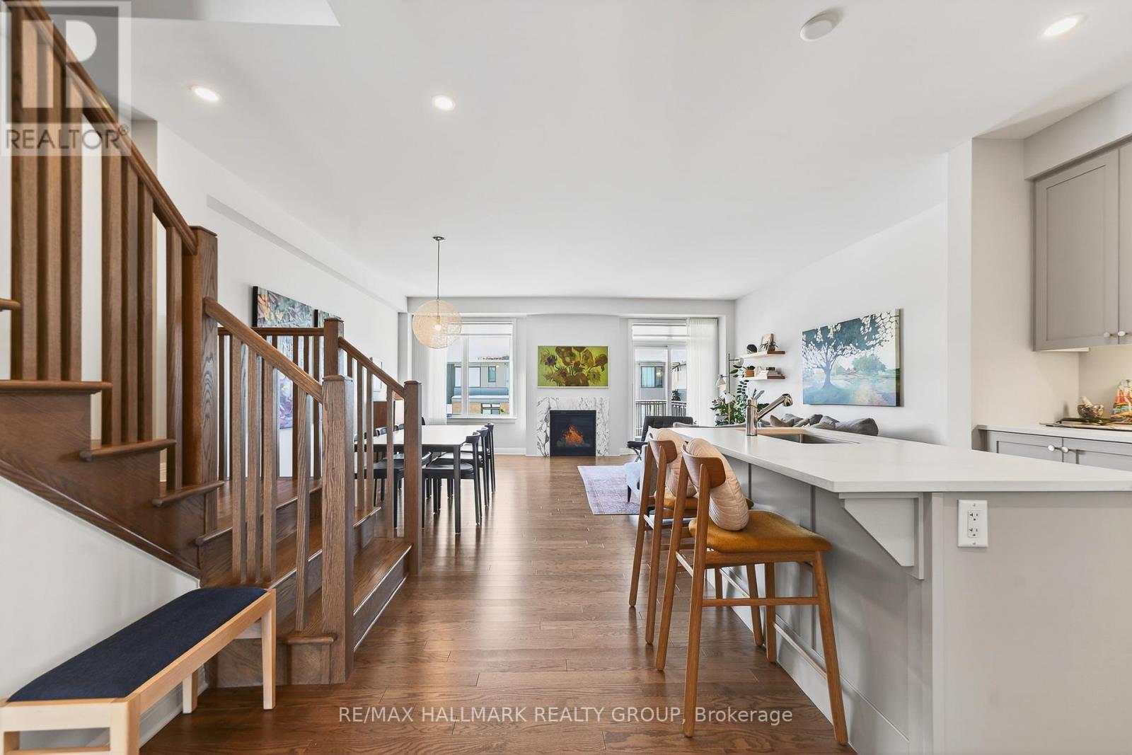 Built by Uniform Developments and designed by Hobin Architecture, this townhome offers approximately 2,100 sq. ft. of living space with over $100,000 in upgrades, including a $35,000 walk-out lot premium. The kitchen features full-height cabinetry, upgraded quartz countertops, and integrated Fisher & Paykel appliances, including a built-in refrigerator, gas range, and double dishwasher. The layout offers excellent flow for everyday living and entertaining. Morning light fills the front bedrooms, ideal for a home office or guest space, while afternoon sun extends through the main and lower levels. A deck off the living room includes a natural gas BBQ hookup. All bedrooms are well proportioned, including a spacious primary suite with a walk-in closet. The walk-out lower level provides bright, flexible living space with large windows and excellent storage. The west-facing backyard is professionally landscaped and fully fenced, featuring large pavers, perennials, a hydrangea tree, and a Japanese maple. Set in the heart of Wateridge Village, surrounded by parks and pathways, with easy access to downtown, Beechwood Village, and the Ottawa River. (id:58075)