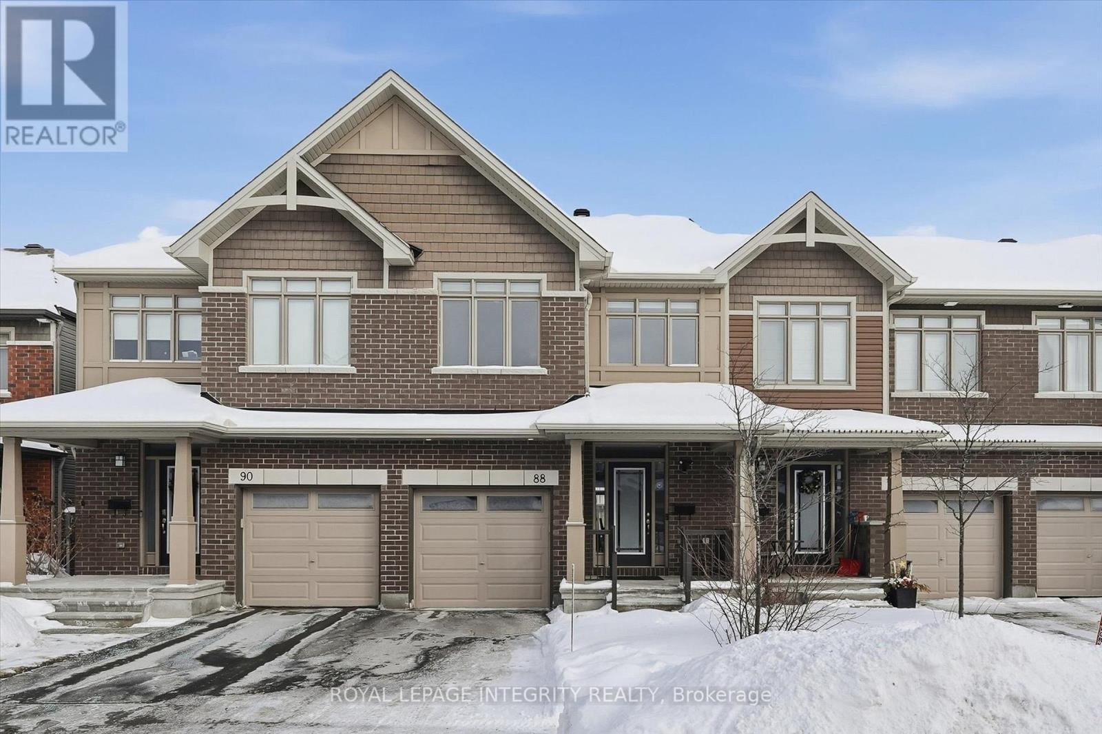 Welcome to 88 Chevron Place, located on a quiet cul-de-sac in a growing, family-friendly neighbourhood! This stylish 3-bedroom, 3-bathroom Energy Efficient certified Claridge Summit townhome offers over 2,300 sq ft of living space (1,869 sq ft above grade plus the finished basement) and is sure to impress. Pull into the driveway with space for two vehicles before stepping into the welcoming foyer featuring a large closet and convenient powder room. Pass by the mudroom with additional storage and inside access to the garage before entering the open-concept main living space highlighted by hardwood and tile flooring. The beautiful kitchen features dark cabinetry, stainless steel appliances, abundant cabinet and counter space, upgraded 42" cabinets, and a stylish brick-pattern backsplash, all overlooking the dedicated dining area and the sun-filled living room complete with a cozy gas fireplace and access to the fully fenced backyard. Upstairs, you'll find the sleeping quarters consisting of a spacious primary bedroom with walk-in closet and a luxurious 5-piece ensuite with dual vanity, glass shower, and separate soaker tub. Two generously sized secondary bedrooms, a full bathroom also featuring a dual vanity, convenient laundry area, and large linen closet complete the level. The finished basement provides a versatile recreation room along with ample storage space. Ideally located close to public transportation, several schools with a new elementary school planned nearby, surrounded by nature and Prescott-Russell walking trails, and just minutes to shopping and all necessary amenities. Book your showing today! (id:58075)