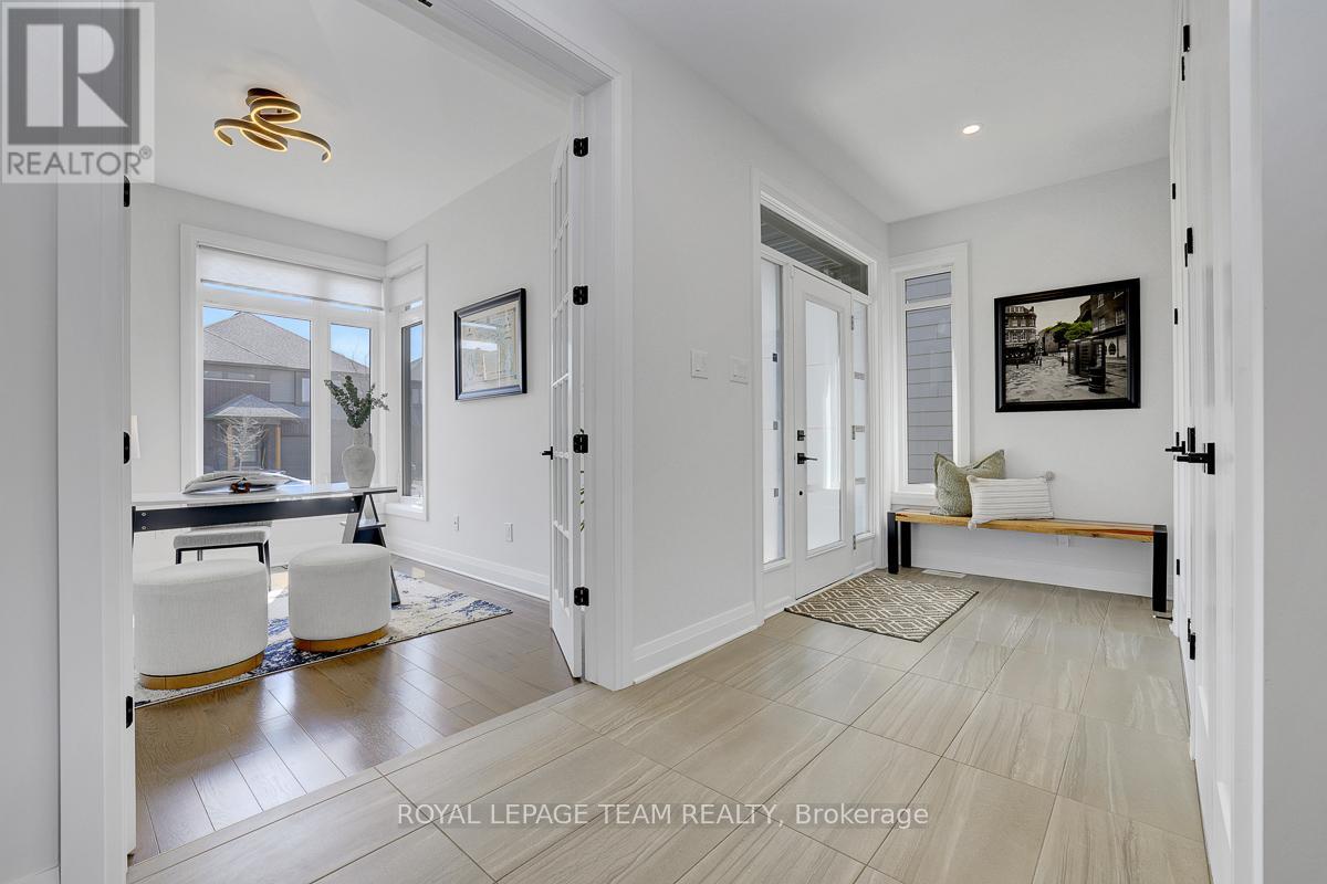 Welcome to this beautifully upgraded 2021 Richcraft built home, set on PREMIUM 44-ft lot with NO REAR NEIGHBOURS - a rare offering that delivers exceptional privacy and long-term value in this family-oriented pocket of Riverside South. Striking curb appeal is enhanced by modern exterior finishes including upgraded steel cedar siding, exterior pot lights, and an interlock walkway. Inside, the bright open-concept main level features soaring ceilings and expansive windows that flood the home with natural light. The spacious living and dining areas are defined by a sleek linear fireplace with a marble surround, creating a warm contemporary focal point. The gourmet kitchen offers an oversized island, quartz countertops, upgraded cabinetry, marble backsplash, and modern range hood. Versatile front room can function as a home office or ADDITIONAL BEDROOM. A powder room and mudroom with direct access to the garage complete this level. Upstairs, retreat to the spacious primary suite featuring a walk-in closet and a large SPA-INSPIRED ensuite featuring a freestanding tub, oversized glass shower with niche, double floating vanity with a quartz countertop. Two additional generously sized bedrooms each with walk-in closets - one with a private ensuite, and the other with its own separate bathroom across the hall. Second floor laundry room adds everyday convenience. The partially finished basement includes an EXTRA BEDROOM and offers flexibility for guests or future living space. With a separate garage entrance (or the option to add a dedicated side door entrance) and rough-in for an additional bathroom, this level presents outstanding potential for an IN-LAW SUITE OR INCOME OPPORTUNITY. Fully fenced backyard creates a peaceful and private outdoor setting. Located close to schools, parks, transit, LRT, the river, and within walking distance to amenities, this home offers a rare combination of modern comfort, privacy, and value in one of Ottawa's fastest growing communities. (id:58075)